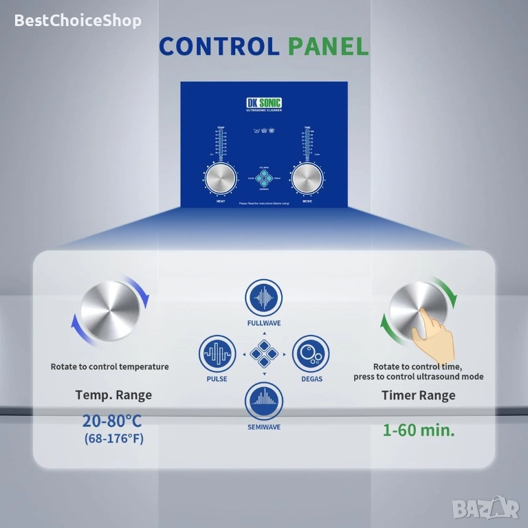 - Множество режими на почистване, предлагани за различни цели: режим FULLWAVE за интензивно изплакване на сложни повърхности; режим SEMIWAVE за почистване на груби повърхности; режим DEGAS за премахване на ултразвуковата умора, за да се подобри почистващият ефект; режим PULSE за динамично изплакване на упорити петна.