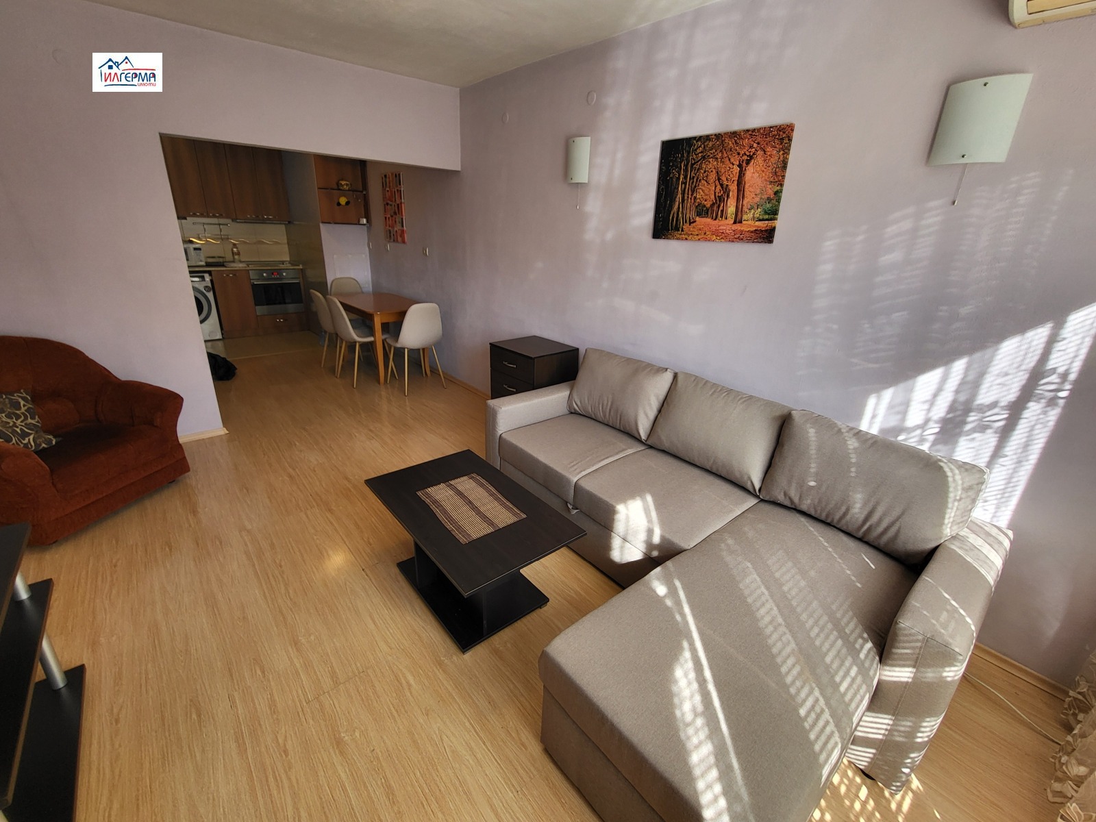 ХОЛ с кухненски бокс: холна секция, мека мебел, телевизор, климатик, трапезна маса с 4 стола, вградена кухня оборудвана с всички електроуреди - фурна, котлони, аспиратор, хладилник, пералня със сушилня.