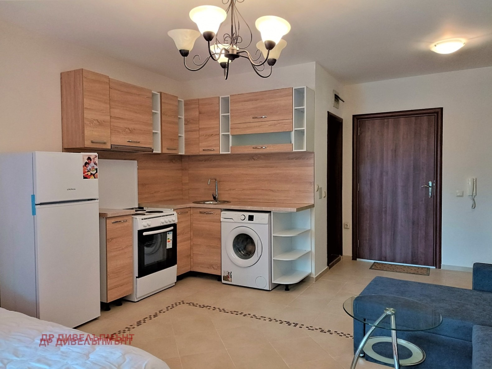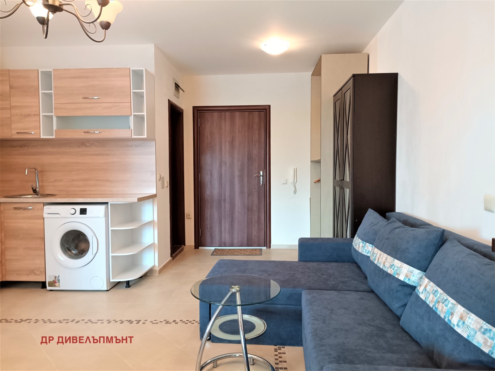 Студиото е напълно обзаведено и оборудвано и се състои от голямо основно помещение с легло спалня и разтегателен диван, оборудван и обзаведен кухненски бокс, баня с тоалетна в едно и горепосочения двор/веранда/тераса с масичка със столчета.