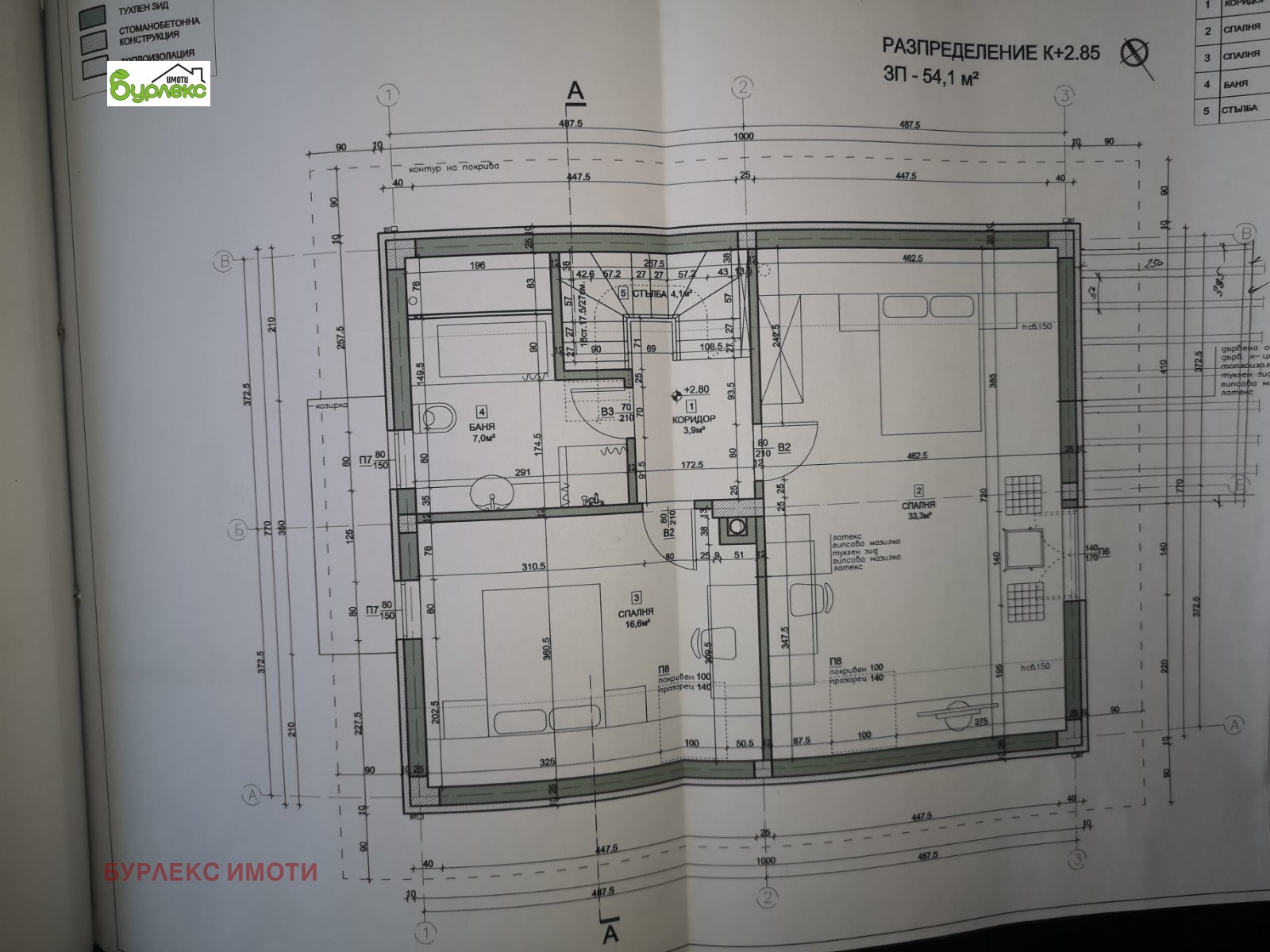 Втори етаж: родителска спалня, огромна детска(33кв.м) спалня с гардеробно помещение , баня с тоалетна.