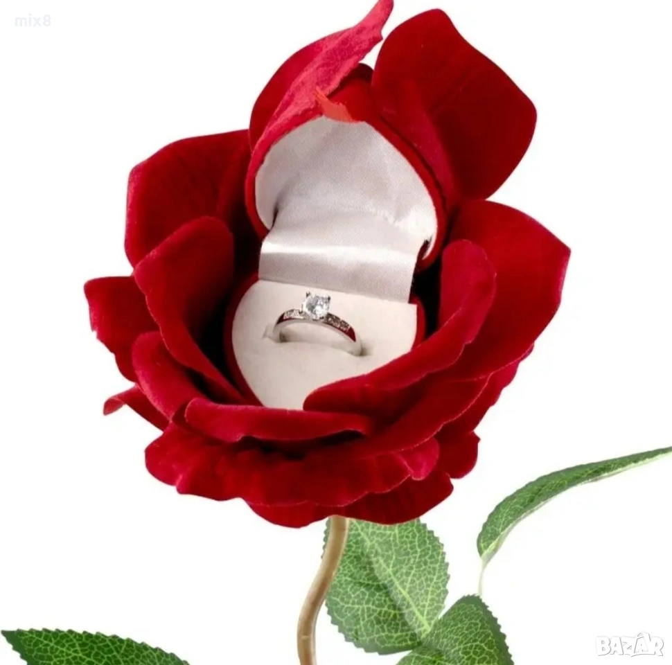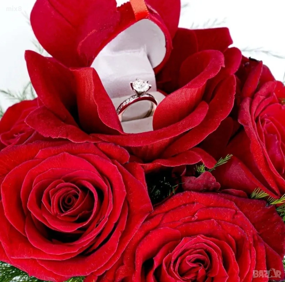 Функционалност: Когато „цветето“ се отвори, вътре се разкрива бяла подплатена част със специален прорез за поставяне на пръстен.