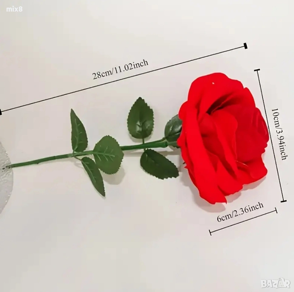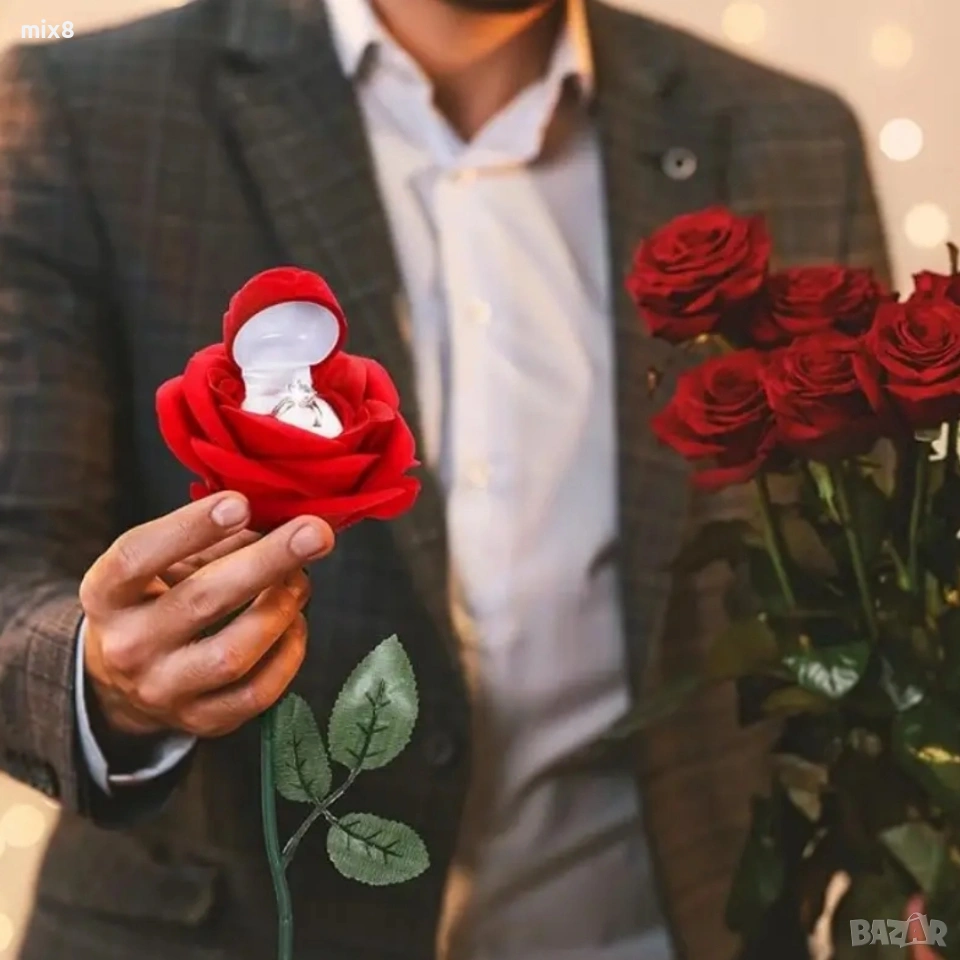 Кутията е изработена от червено кадифе, което ѝ придава реалистичен вид на истинска роза.