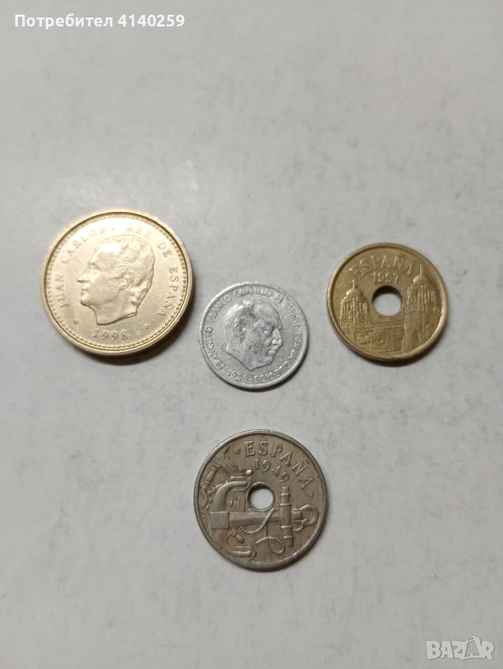 ИСПАНИЯ МОНЕТИ 25 ПЕСЕТИ 1997 Г 100 ПЕСЕТИ 1998 Г 50 САНТИМОС 1949 Г 10 СЕНТИМОС 1959 Г НЕЧИСТЕНИ ЦЕНА ЗА 4 БРОЯ СЪСТОЯНИЕ ВИДИМО ПОЛУЧАВАТЕ СНИМАНИТЕ МОНЕТИ РАЗГЛЕДАЙТЕ ДРУГИТЕ МИ ОБЯВИ ДА КОМБИНИРАТЕ ДОСТАВКА ЕКОНТ ЗА ВАРНА ЛИЧНО