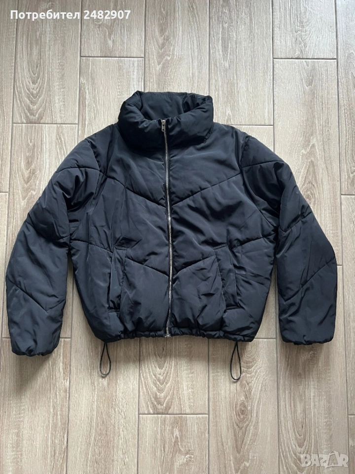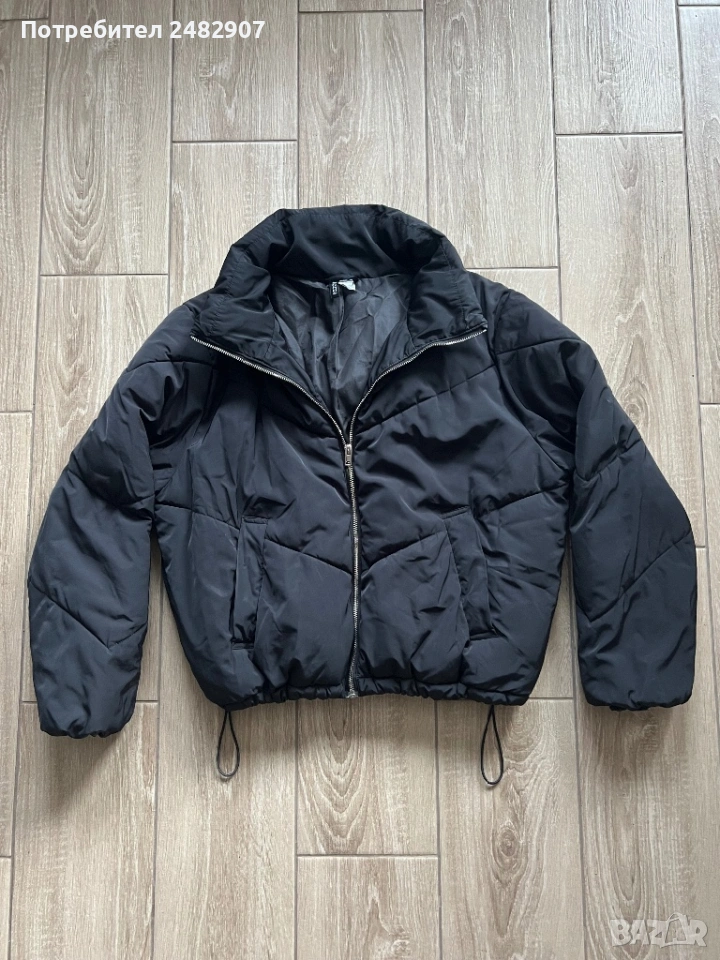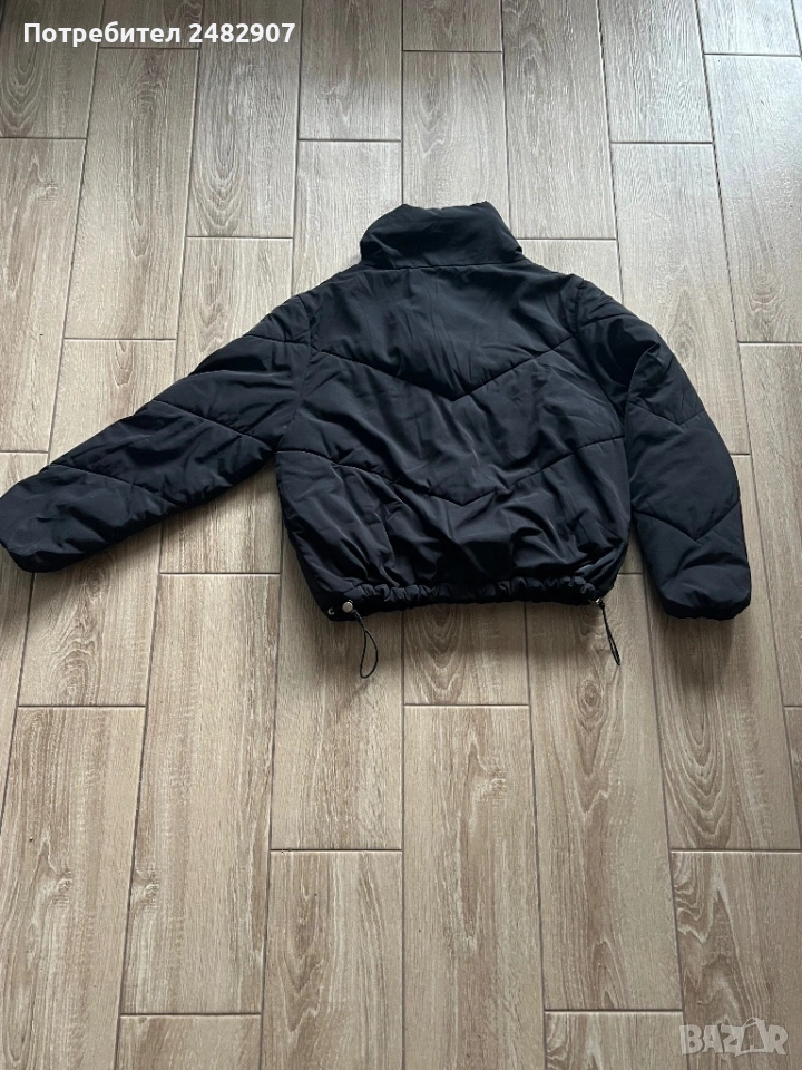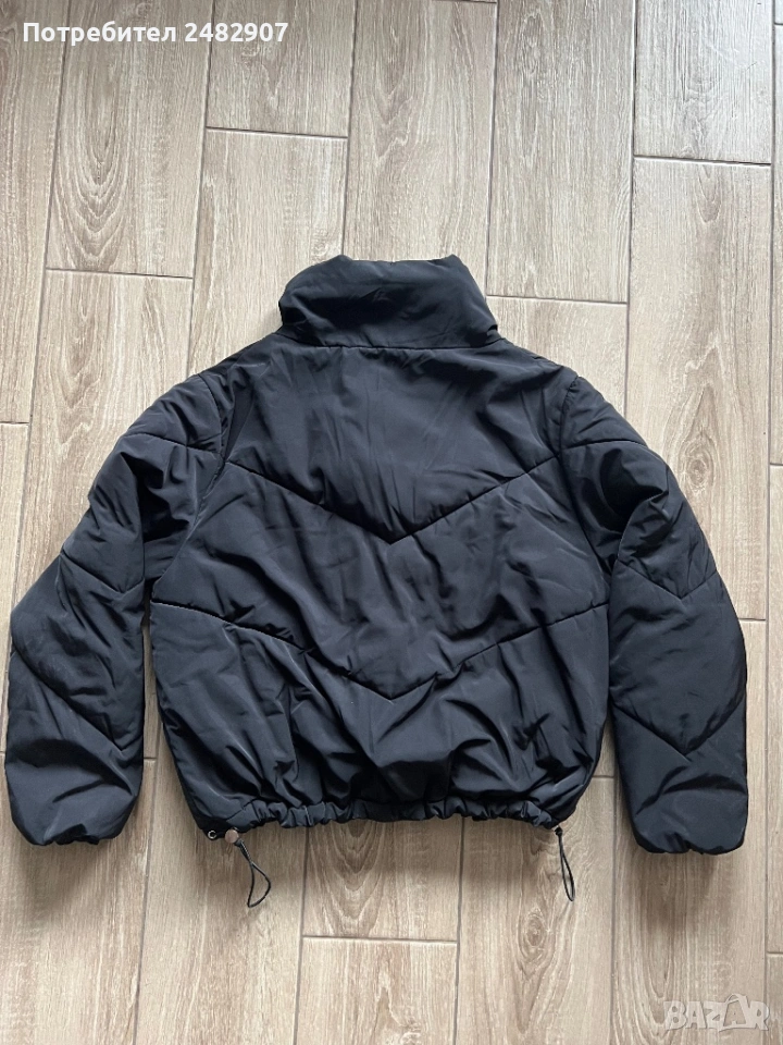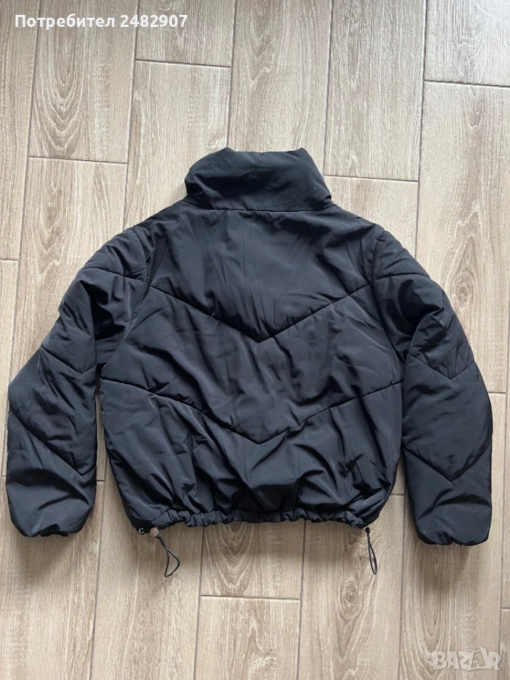 Черно дамско яке, размер М. Съдържа 100 % полиестер. Ширина в раменете - 51 см, ширина под мишниците - 61 см, ширина в долната част - 43 см, дължина от рамото до долу - 59 см, дължина на ръкава от рамото - 61 см, ширина на ръкава в долната част - 9 см. Много запазено, почти не е използвано, без забележки, с ластик на ръкавите, два джоба и ластик и връзки в долната част за регулиране на ширината.