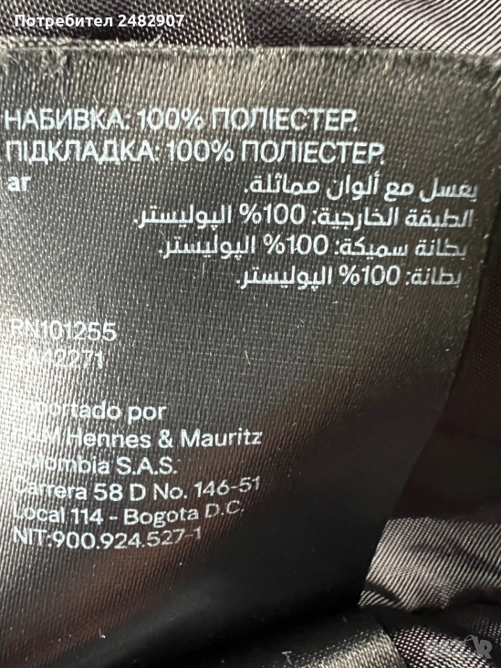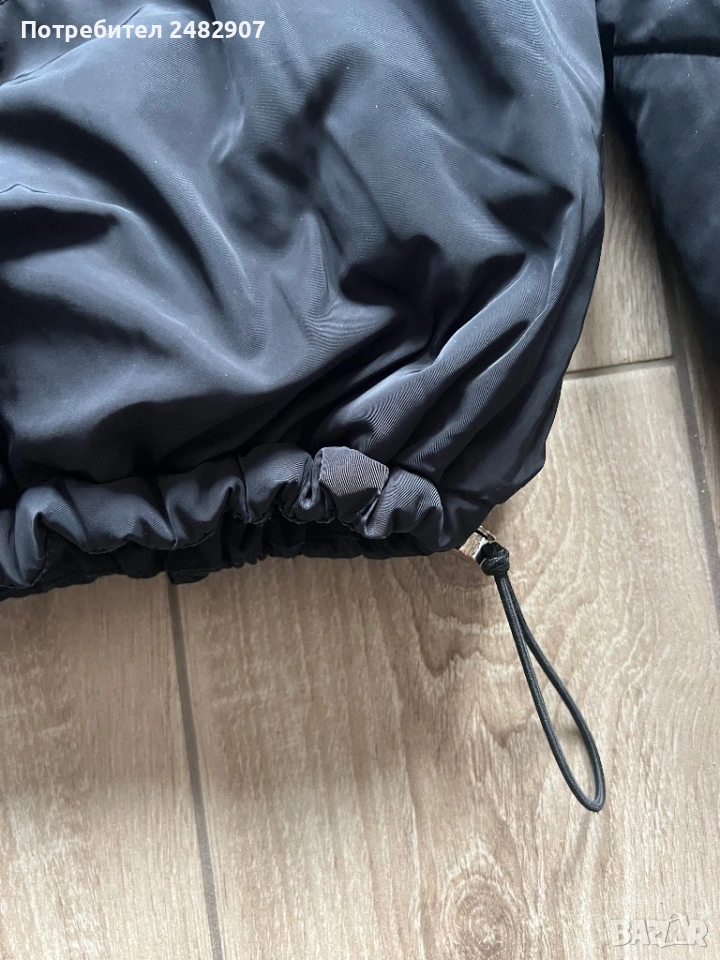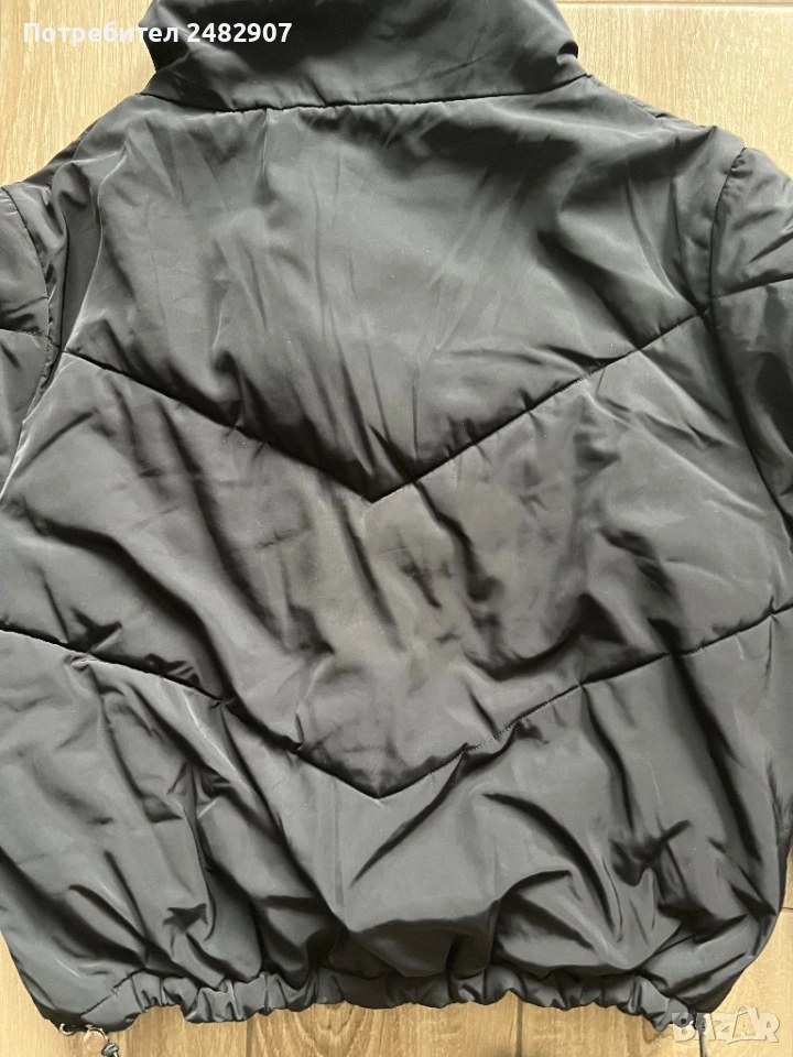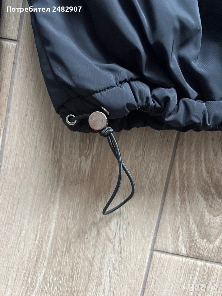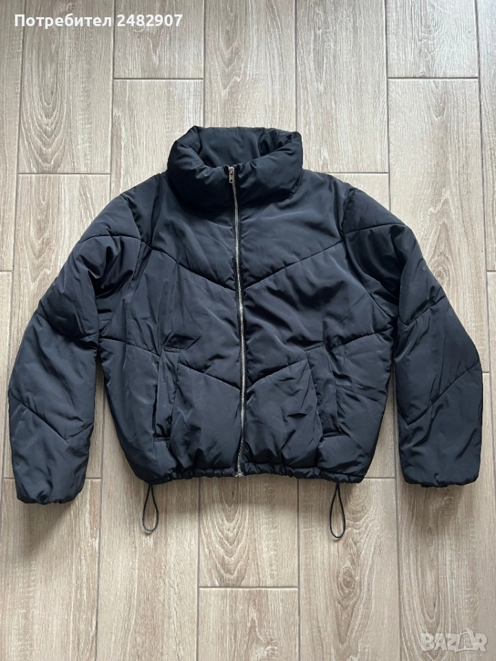 Черно дамско яке, размер М. Съдържа 100 % полиестер. Ширина в раменете - 51 см, ширина под мишниците - 61 см, ширина в долната част - 43 см, дължина от рамото до долу - 59 см, дължина на ръкава от рамото - 61 см, ширина на ръкава в долната част - 9 см. Много запазено, почти не е използвано, без забележки, с ластик на ръкавите, два джоба и ластик и връзки в долната част за регулиране на ширината.