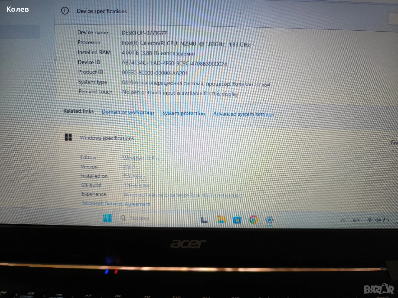 Лаптоп Acer Aspire ES1-512/,Intel Celeron N2940, RAМ 4GB DDR3, HDD 320GB. Батерия над 4 и половина часа. Windows 11Pro, Word, Excel - лицензирани. Оригинално зарядно.