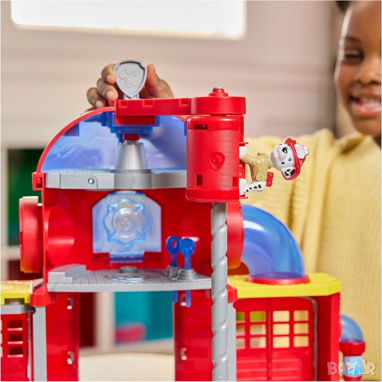 Гмурни се в света на PAW Patrol с Fire Rescue Пожарна станция! Приготви се за вълнуващи спасителни мисии с командния център на пожарникарския екип на PAW Patrol! С височина 38 см, тази впечатляваща играчка е пълна с ефекти от светлини и звуци, които ще накарат всяко дете да се почувства като част от истинския екип на PAW Patrol. Маршал и неговият пожарен камион са готови да се впуснат в действие! Комплектът включва няколко зони за игра – рампa за изстрелване на превозни средства, площадка за кацане, спускателна тръба и пожарникарски пилон. Зареди изстрелвача на вода с водни снаряди и ги изстреляй, за да угасиш въображаемите пламъци! Когато настъпи време за действие, постави Маршал на пожарникарския пилон и наблюдавай как се спуска спираловидно надолу. После напълни камиона на станцията за зареждане с вода, постави го на рампата за изстрелване и стартирай мисията! Можеш дори да използваш отделящата се стълба за още повече въображаеми приключения.