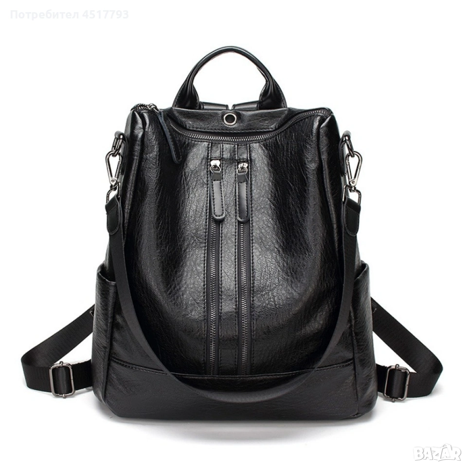 Стилна, мека, дамска кожена раница с голям капацитет / Цвят: Черен, кафяв / Комплект: 1 бр дамска раница; 1 бр малка чантичка; 1 бр портмоне. / Височина: 35 см; Ширина: 32 см; Дълбочина: 14 см./ Два големи, ципа по цялата дължина на предната част