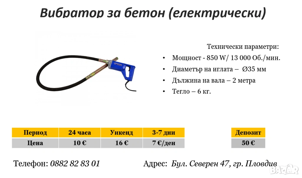Вибратор за бетон 2м под наем → Обява 53601989