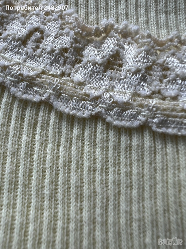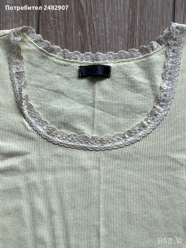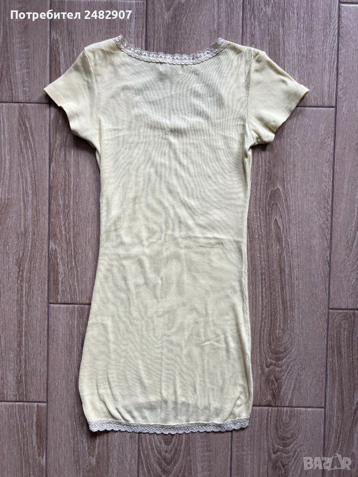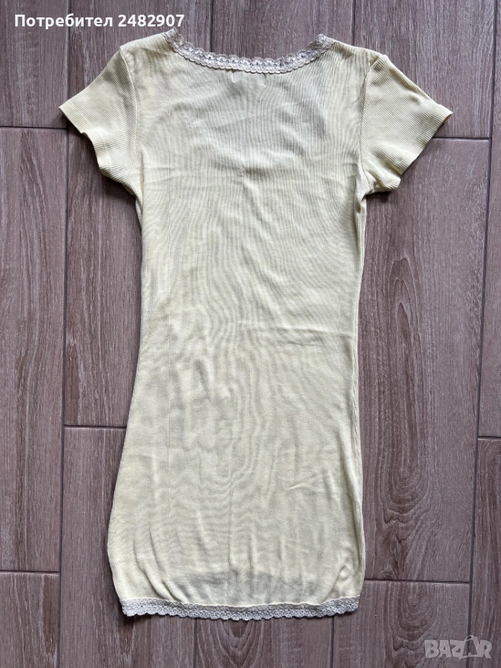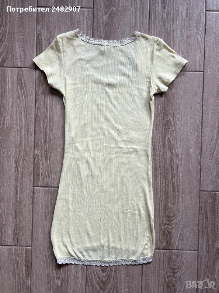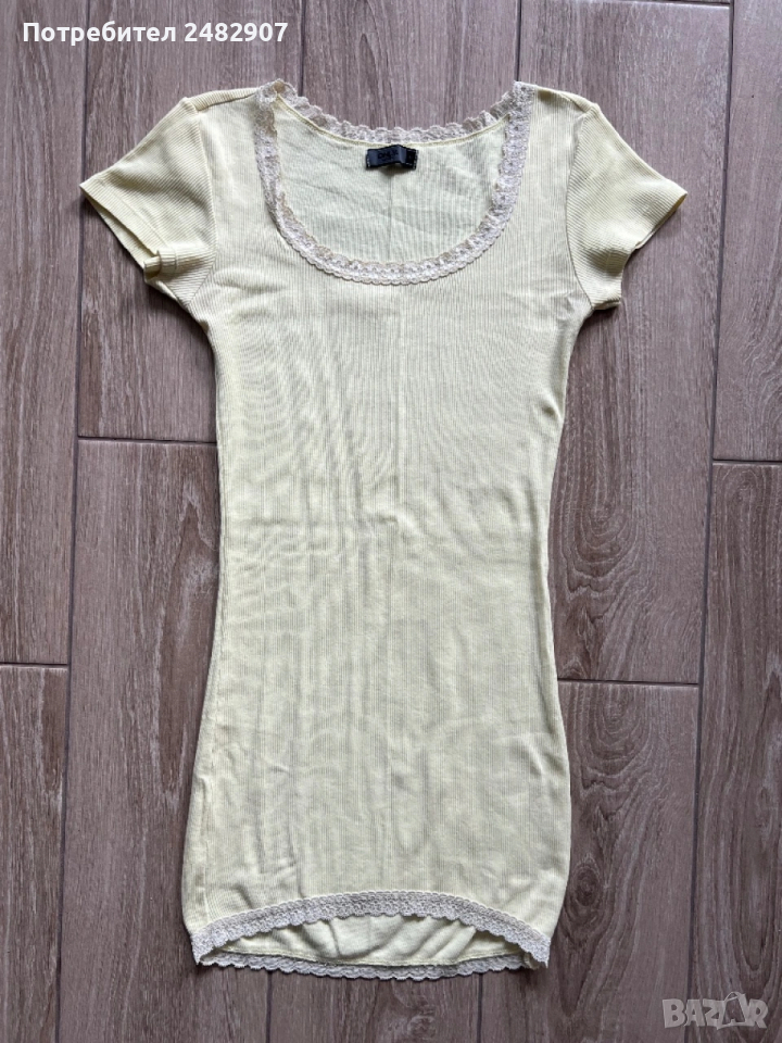 Бледо жълта дамска рокля/Туника, размер М. Съдържа 100 % памук. Ширина в раменете - 35 см, ширина под мишниците - 38 см, ширина в долната част - 33 см, дължина от рамото до долу - 75 см (отпред) и 79 см (отзад), дължина на ръкава от рамото - 11 см, ширина на ръкава в долната част - 14 см. Много запазена, почти не е използвана, с дантела на деколтето и в долната част, без забележки.