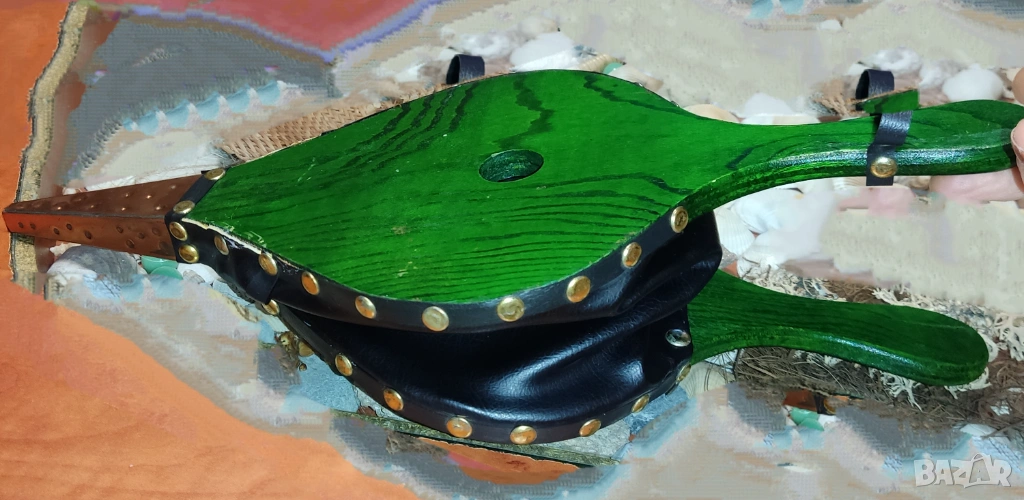 • Дървените части са боядисани зелено. Меха е от здрава.дебела естествена кожа и меден накрайник. Не е ползвана. Като нова.