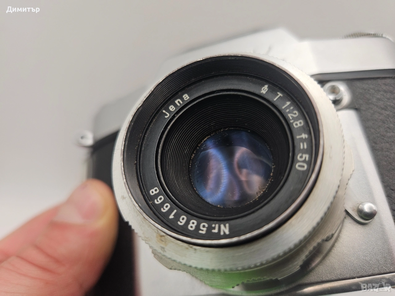 Здравейте, продавам този лентов фотоапарат на Exa 2 с обектив на Jena T 1:2,8 f=50. Апаратът работи и както и обективът към него. За София може лично предаване. За страната изпращам по куриер с преглед и тест