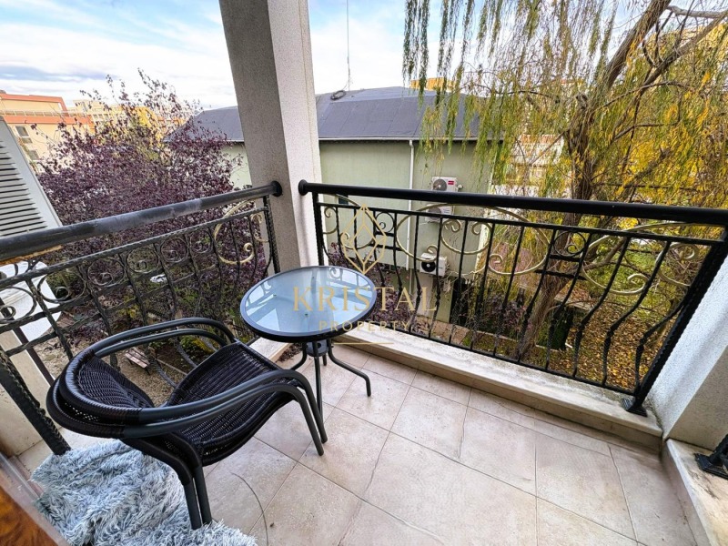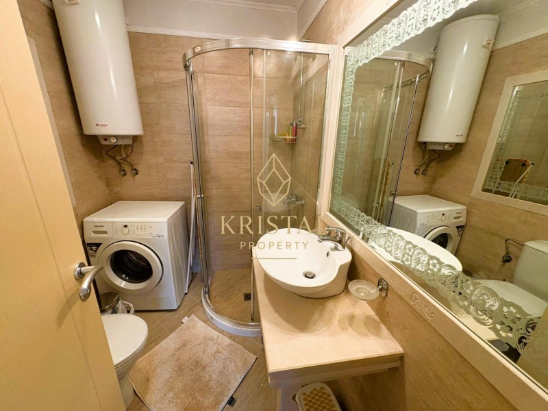 Разпределение: хол с кухня и трапезария, 2 спални, 2 бани с душове, 2 балкона. Обзаведен с мебели и уреди. В отлично състояние. Красивата, озеленена територия на комплекса включва: два басейна за възрастни и деца, беседки и бар. 24-часова охрана и видеонаблюдение. Целогодишна поддръжка. Акт 16.