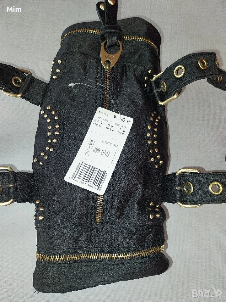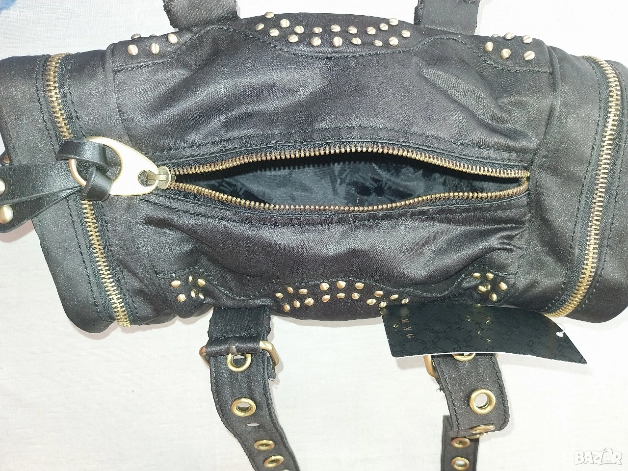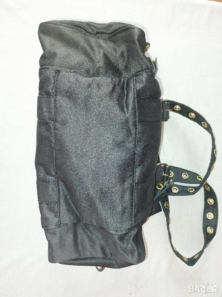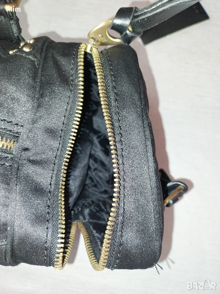 Черна дамска чанта от сатенен плат с капси с дръжки който се регулират ,дължина 33 см дълбочина 15 см широчина 15 см ,дължина на дръжката 72 см с много джобове, на дръжките липсват две капси на последната снимка са показани в преден план ,съобразно с цената. Нова с хартиен носител.