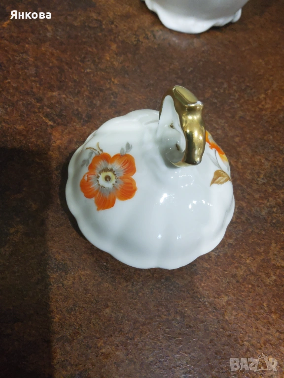 Предлагам разкошен и изключително рядък чайник на Schwarzenhammer Bavaria, произведен в периода 1905-1923г.Този модел като цяло е много рядко срещан, а точно този мотив, лично аз никъде не открих. Цвят слонова кост. Здрав,чист,абсолютно прекрасен, с идеално запазена позлата Едно единствено леко протриване на едно от цветята ( снимка).Вместимост 1.100мл, височина с капак 22см.Златиста маркировка. Цена 25евро/48.90лв. лв.