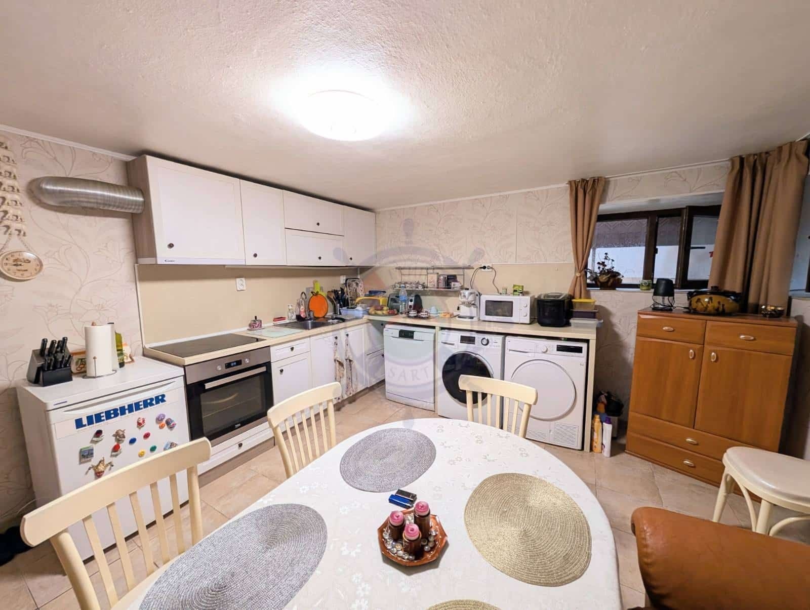 Първият етаж е със самостоятелен вход и се състои от дневна с кухненска ниша, две спални, баня с тоалетна и голямо входно антре. Къщата е със обща затроена площ 94.47 кв.м и 192,50 кв.м идеални части от ПИ в който е построена. Към имота има таванско помещение с площ 32 кв.м и полусутеренно ниво, където е разположена втора всекидневна с кухня и складово помещение с обща площ 32 кв.м. Предлага се частично обзаведена и оборудвана.