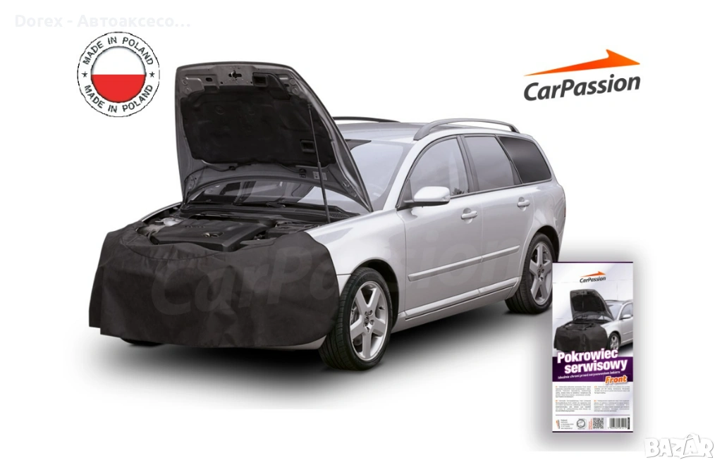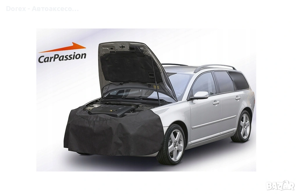 Универсално висококачествено предпазно покривало CarPassion за предната част на автомобила. Предназначено за многократна употреба и защита по време на ремонтни дейности.