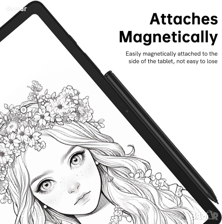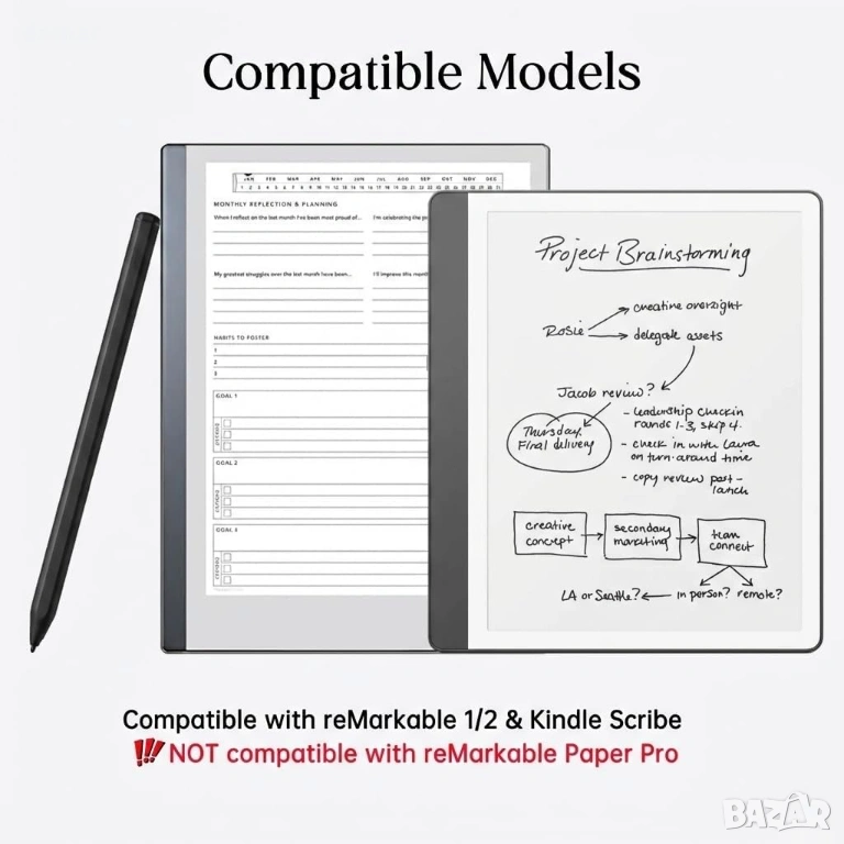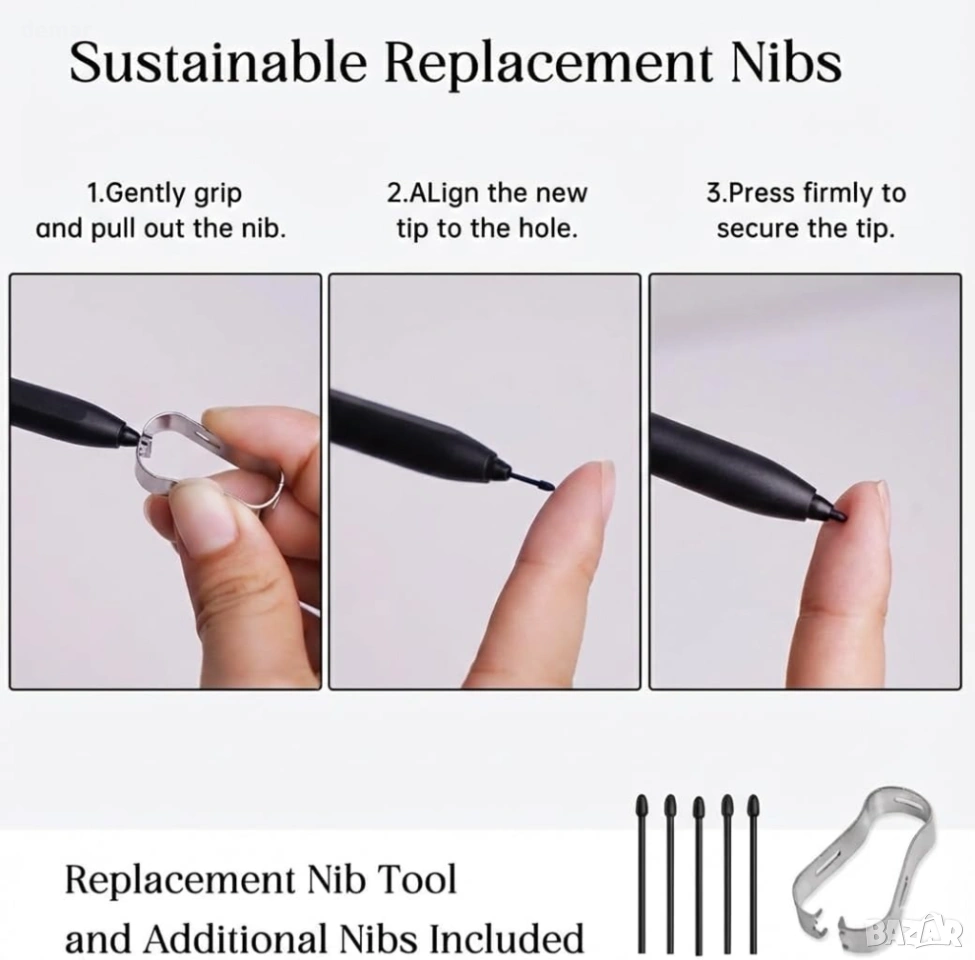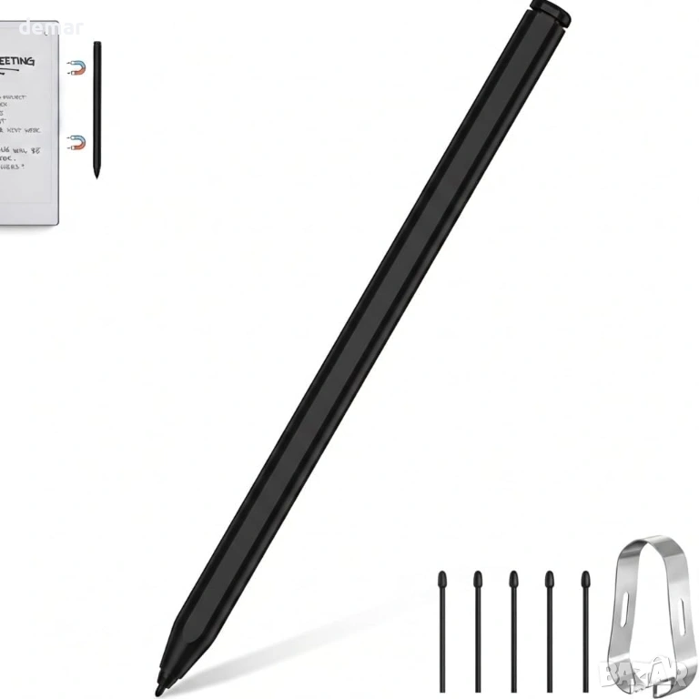 EMR стилус, проектиран специално за reMarkable 1/2 и Kindle Scribe, с 4096 нива на чувствителност на натиск за прецизно и естествено писане и рисуване. Технологията за отхвърляне на дланта позволява комфортна употреба с ръка, поставена върху екрана, без ръкавици, а вградената гумичка на края на писалката позволява бързи и безпроблемни корекции без допълнителни настройки. Магнитното закрепване осигурява сигурно съхранение и лесно пренасяне, като помага за предотвратяване на загуба и поддържа писалката леснодостъпна. Комплектът включва един стилус и пет резервни накрайника.