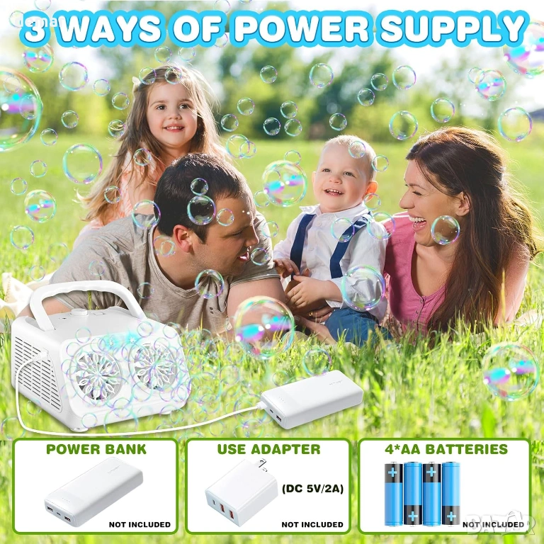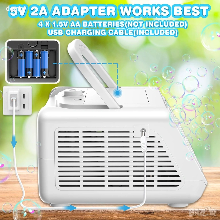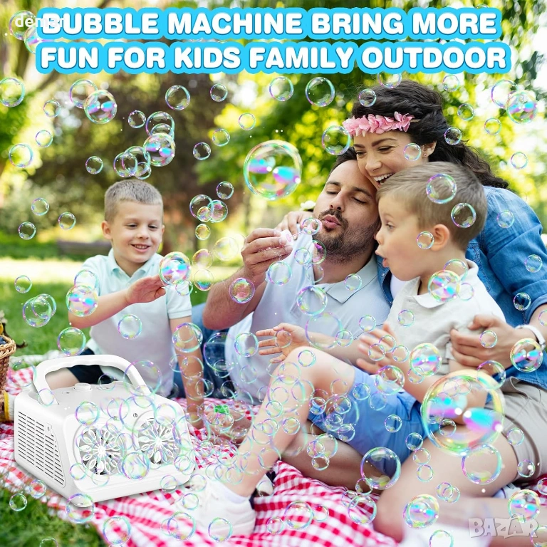 Високопроизводителна машина за балончета, произвеждаща над 22 000 цветни балончета в минута, за да създаде завладяваща атмосфера на открито за партита, рождени дни, къмпинг и игра в градината. Изработена от издръжлива, устойчива на ръжда ABS пластмаса с леко тяло и ергономична дръжка за носене за лесно транспортиране и дългосрочна употреба. Проектирана специално за външна употреба с устойчива на атмосферни влияния конструкция и гъвкави опции за захранване, включително 4×AA батерии, USB връзка или съвместимост с power bank. Разполага с проста, минимизираща бъркотията система за пълнене, използваща включената бутилка с разтвор и концентриран пълнител, като същевременно поддържа и подходящи течности за балончета от трети страни. Идеална като забавен и ангажиращ подарък за малки деца и малки деца, насърчаващ активната, сензорна игра.