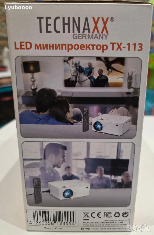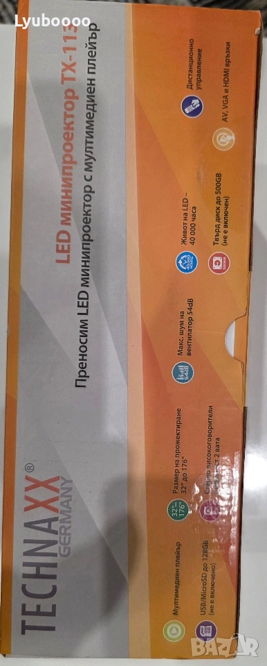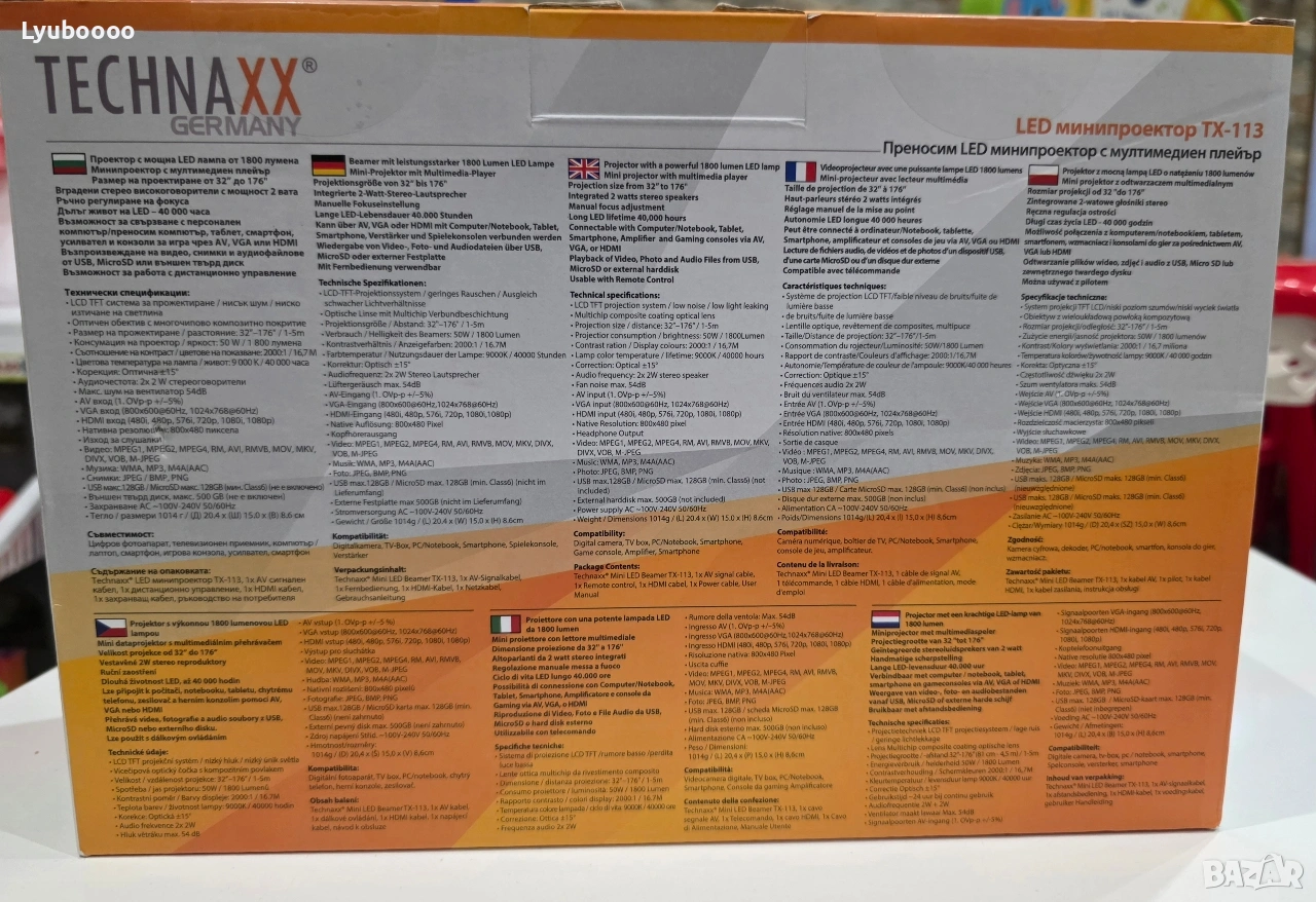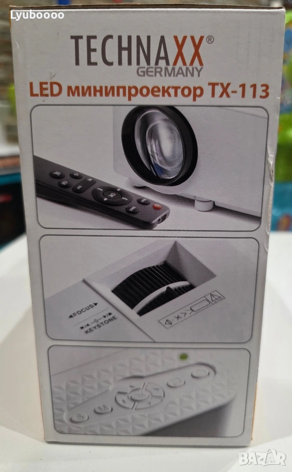 Проектор Technaxx TX-113 - чисто нов Производител - Technaxx Germany Разполага с ръчно регулиране на фокуса . Има възможност за свързване с: 1.компютри 2.таблети 3.смартфони 4.гейминг конзоли-чрез AV, VGA или HDMI Може да възпроизвежда: 1.снимки(JPEG, BMP, PNG) 2.видео(MPEG1, MPEG2, MPEG4, RM, AVI, RMVB, MOV, MKV, DIVX, VOB, M-JPEG) 3.аудио записи(WMA,MP3, M4A/AAC) Към комплекта има дистанционно управление. Цвяг- бял . Технология-LCD TFT система . Живот на обектива-40 000 часа. Размер на прожекция-32″-176″ на разстояние 1.5м. Яркост-1800lm. Технология-LCD TFT система . Консумация на енергия-50W. Контраст-2000:1. Резолюция-800x480px. Ниво на шум-54dB. Аудио честота-2 x 2W. Време на продължително използване-24 часа. Слот за карта памет(до 128GB). Слот за USB(до 128GB). Слот за хард диск(до 500GB). Изход за слушалки. Комплектът включва:мини проектор,AV захранващ кабел,HDMI кабел,ръководство за употреба.