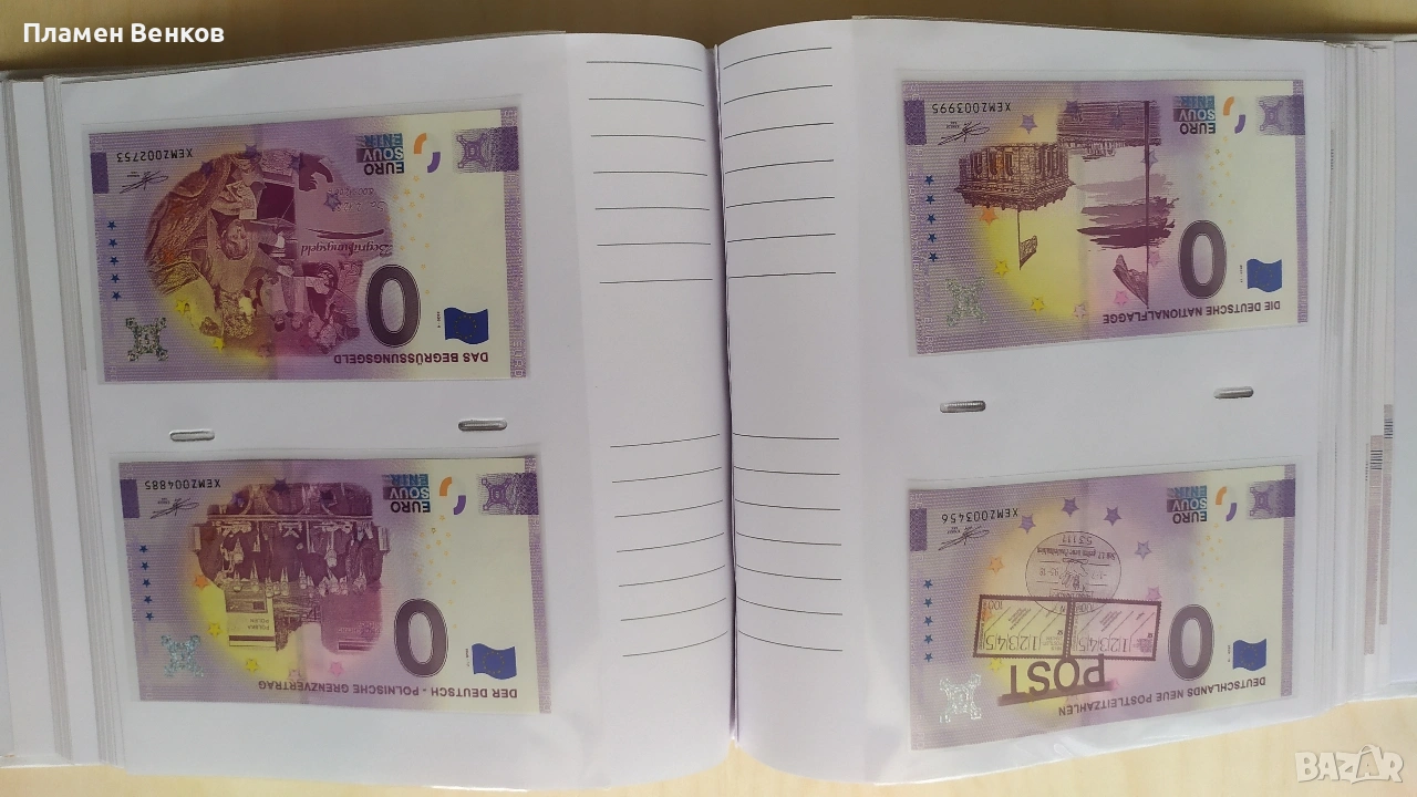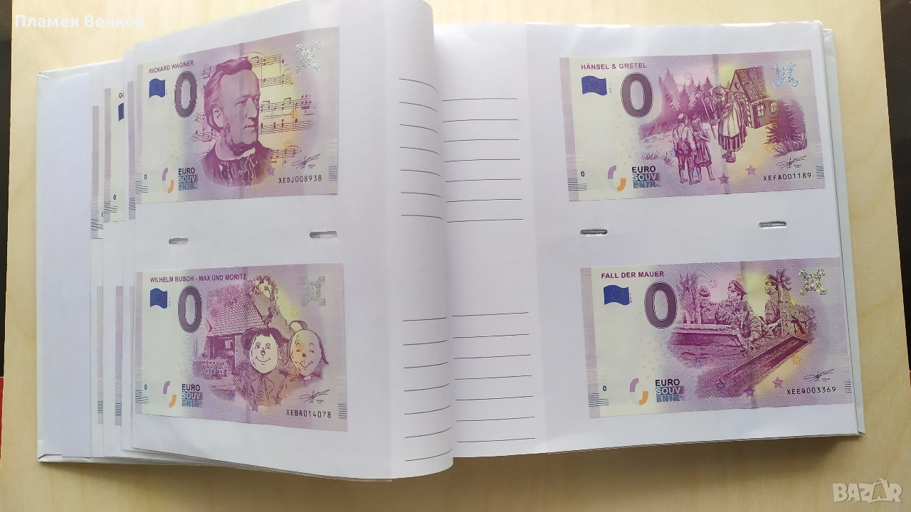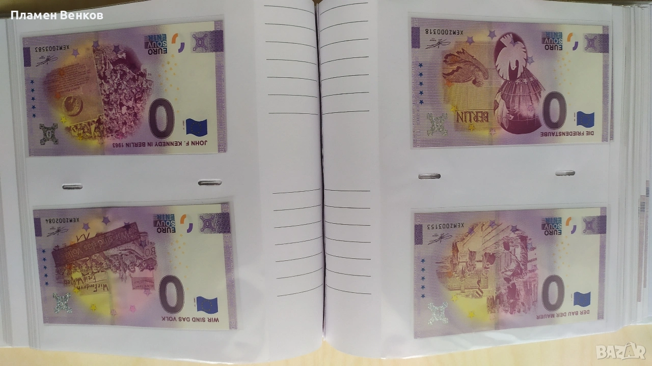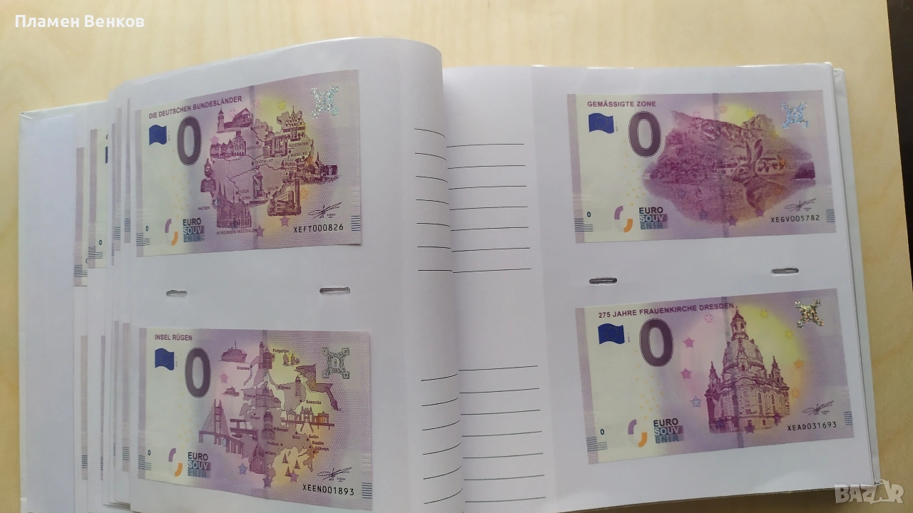 Продавам колекцията си от сувенирни банкноти 0€, събирана от мен няколко години докато живях в Германия. Банкнотите са 91 броя с мотиви от немската и световна политика, култура, архитектура, спорт... Колекцията е сертифицирана от mdm.de, от където са закупени и всички банкноти. Сувенирните банкноти не са циркулирали или прегъвани, отлично качество, подредени са в оригиналният им албум. При сериозен интерес мога да изпратя снимки на цялата колекция, като към нея ще направя и подарък - книга фотоалбум "Германската независимост", в която са описани ключови събития от германската история и как са се озовали като мотив на сувенирните банкноти.