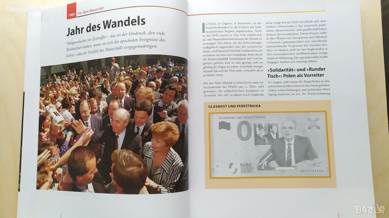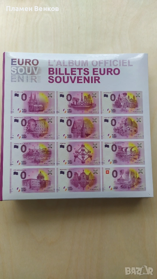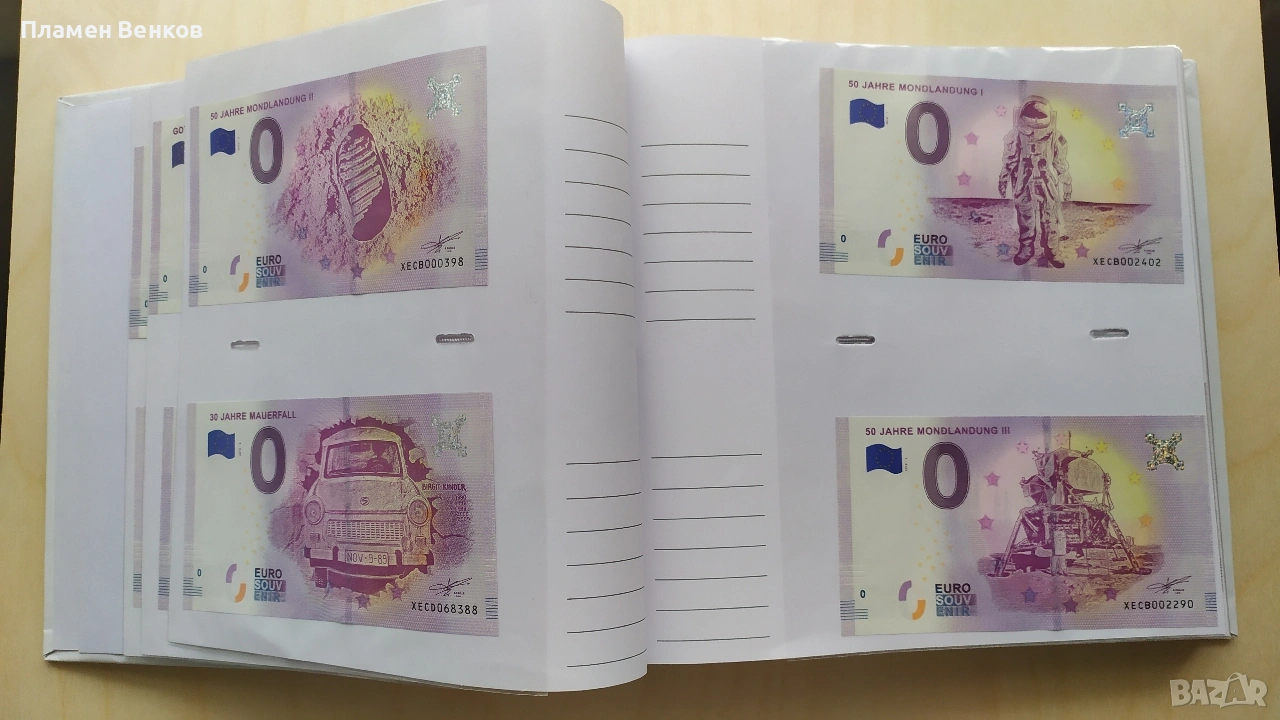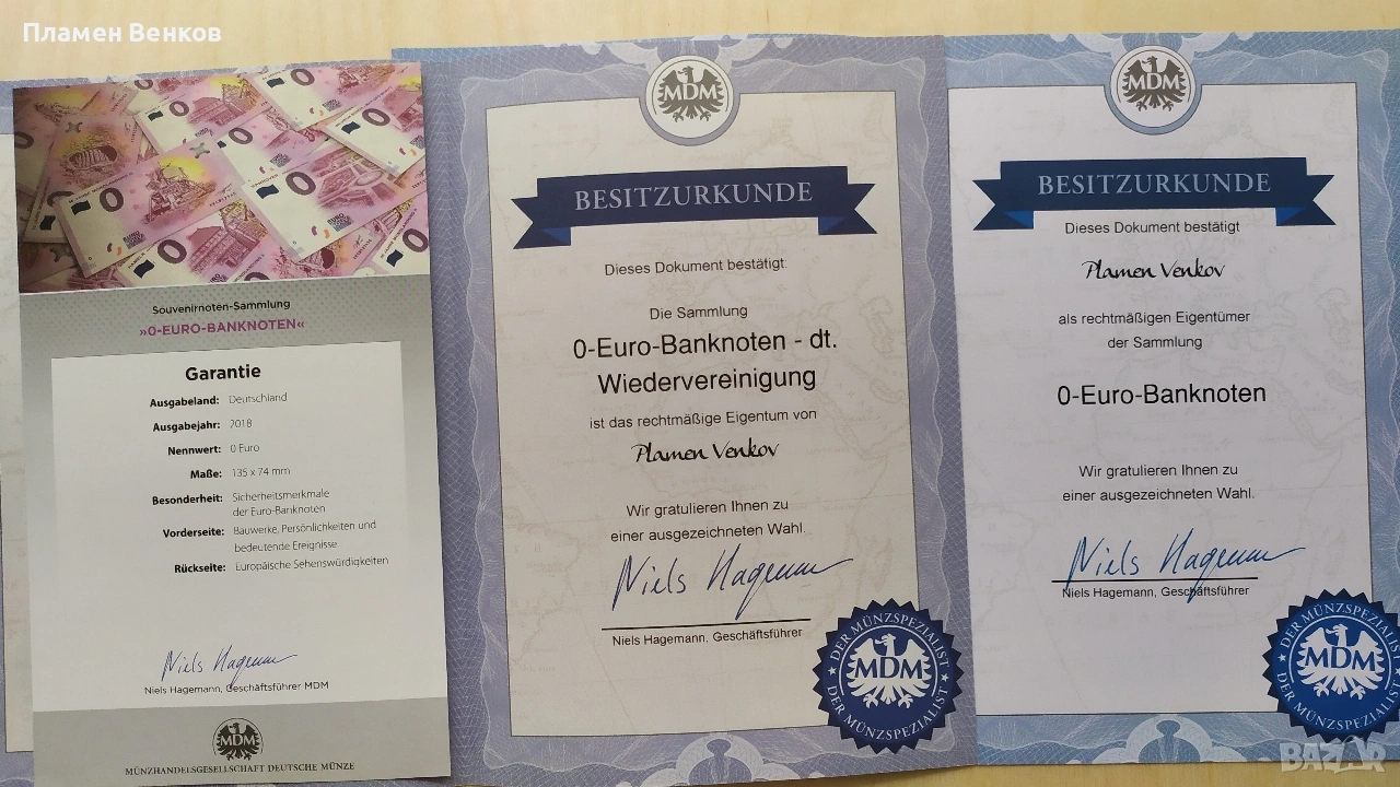 Продавам колекцията си от сувенирни банкноти 0€, събирана от мен няколко години докато живях в Германия. Банкнотите са 91 броя с мотиви от немската и световна политика, култура, архитектура, спорт... Колекцията е сертифицирана от mdm.de, от където са закупени и всички банкноти. Сувенирните банкноти не са циркулирали или прегъвани, отлично качество, подредени са в оригиналният им албум. При сериозен интерес мога да изпратя снимки на цялата колекция, като към нея ще направя и подарък - книга фотоалбум "Германската независимост", в която са описани ключови събития от германската история и как са се озовали като мотив на сувенирните банкноти.