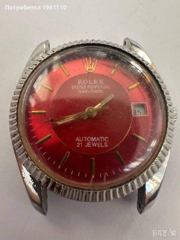 Предлагам стилен мъжки часовник Rolex Oyster Perpetual, от старият материал. Състояние според снимките, не работи. Не съм го отварял и не съм го карал на часовникар.