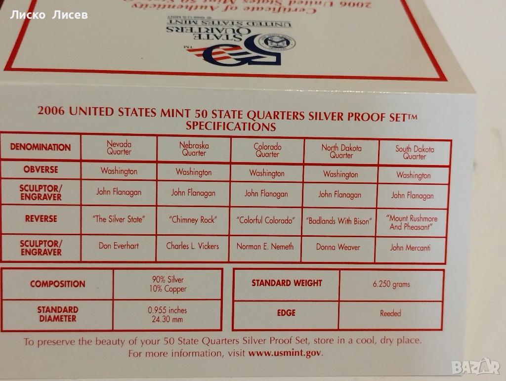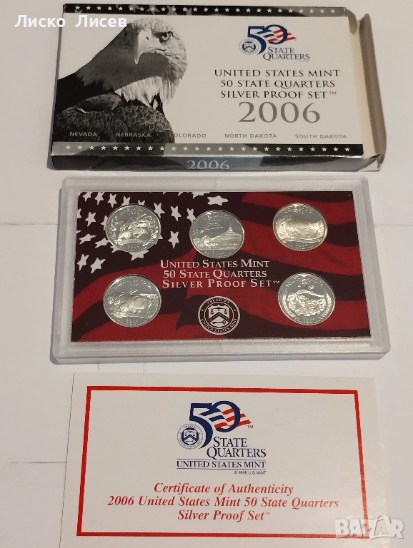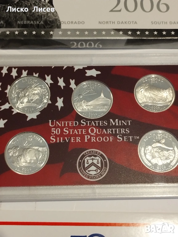 САЩ 2006г. комплект 5 броя сребърни 25 цента мат-гланц → Обява 53605523