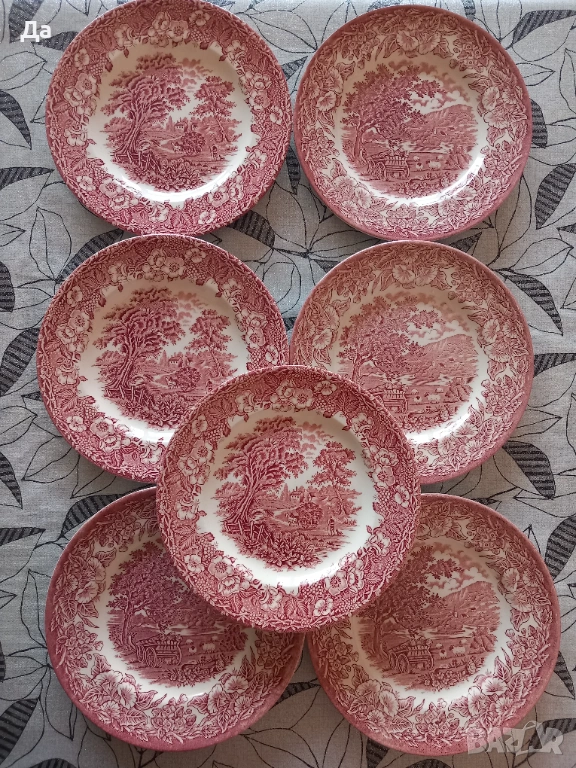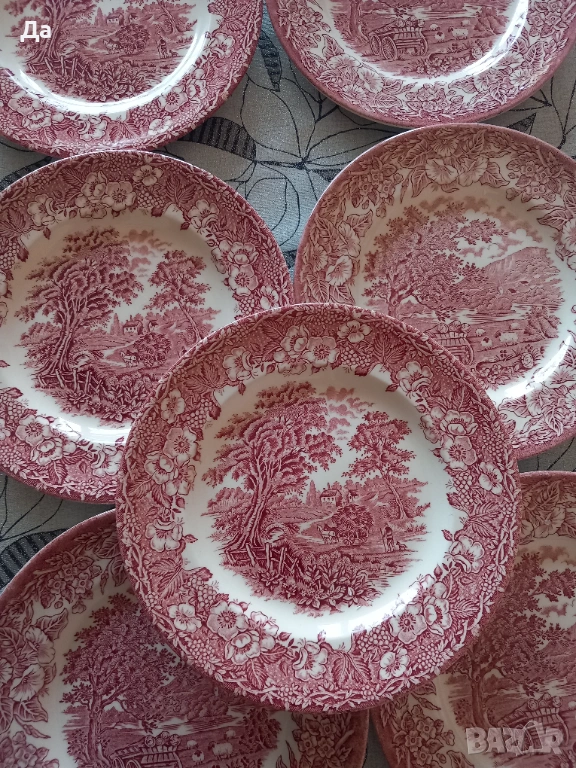 Седем чинии английски порцелан,със винтидж ретро селски къщи мотиви.Ръчно рисувани.Диаметър 20см