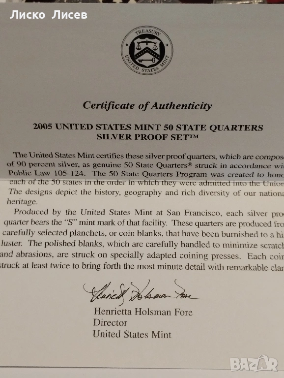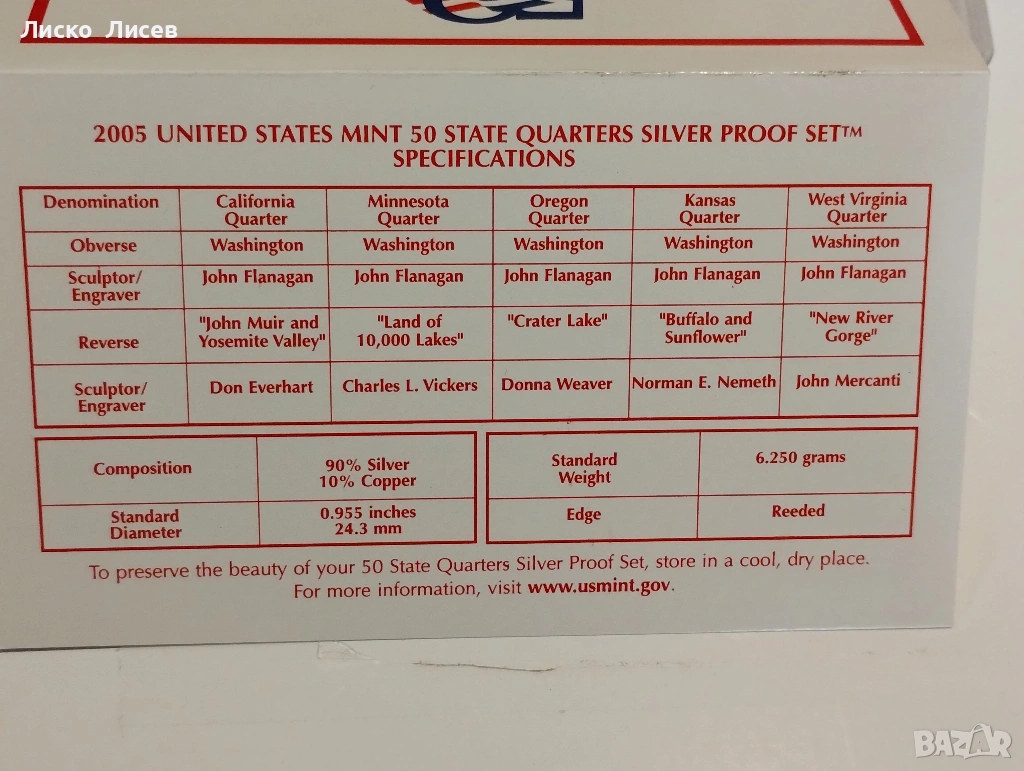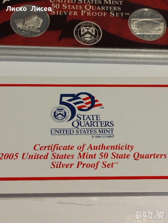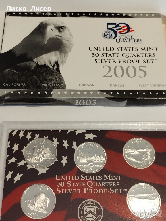 САЩ 2005г. комплект 5 броя сребърни 25 цента мат-гланц → Обява 53605563