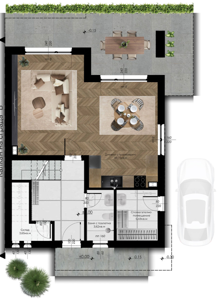Имотът ще бъде завършен с модерен плосък покрив, изпълнен с фибран (XPS топлоизолация) и двойна хидроизолация, което гарантира отлична защита от влага и много добра енергийна ефективност. Професионално изпълнено озеленяване с палми, създаващо уютна и стилна среда.