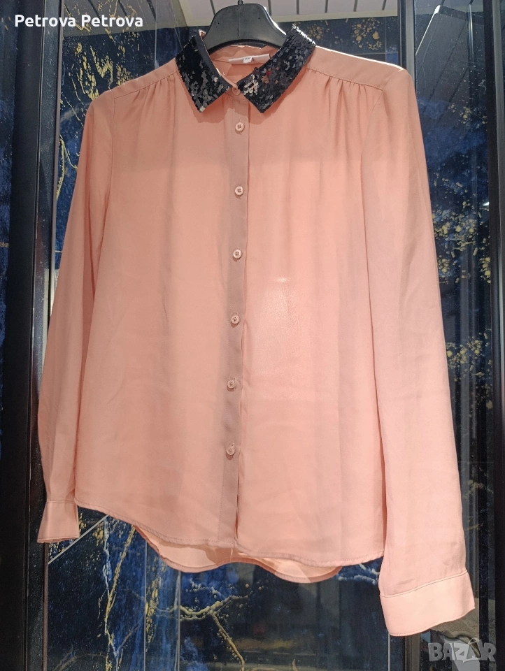 Риза цвят пепел от рози с черни пайети на яката.