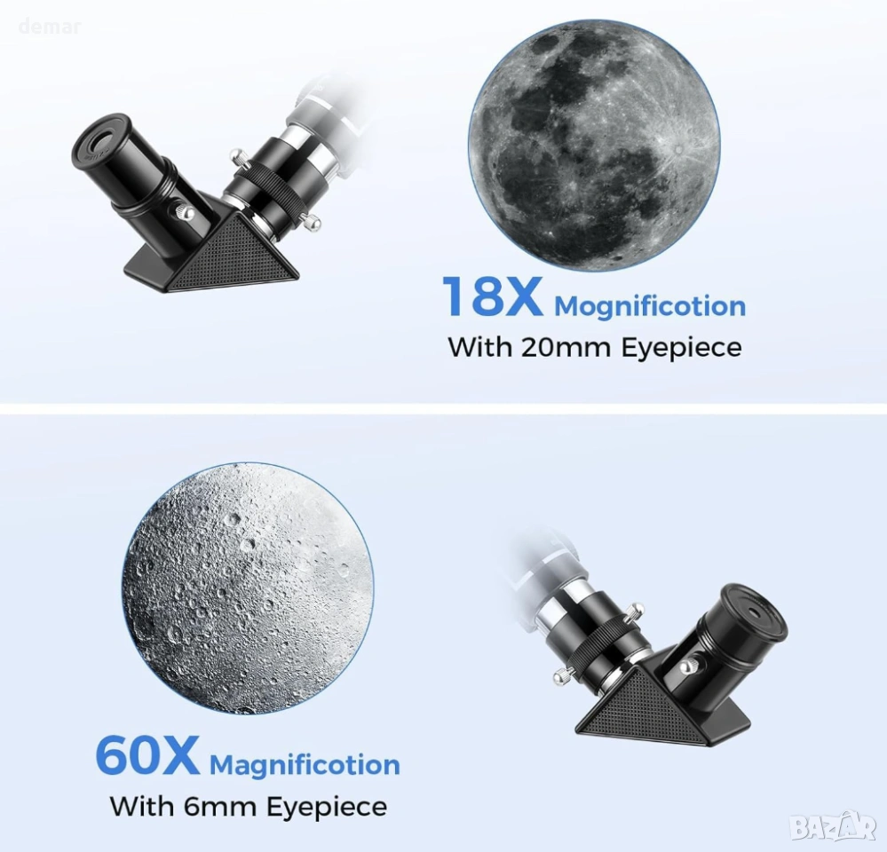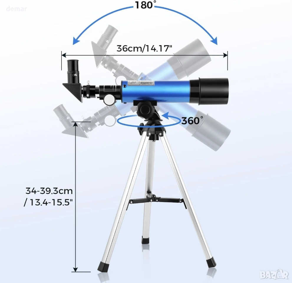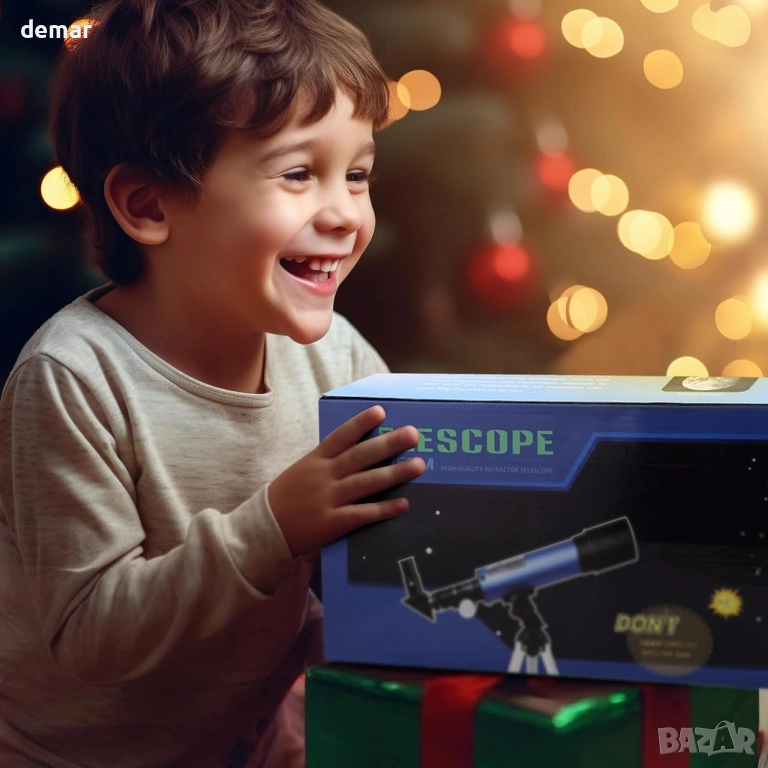 Този астрономически телескоп, подходящ за начинаещи, разполага с апертура от 50 мм и фокусно разстояние от 360 мм с изцяло покрито оптично стъкло за ярки, ясни изображения и точно възпроизвеждане на цветовете. Включва два сменяеми окуляра, осигуряващи 18x и 60x увеличение, заедно с лунен филтър за намаляване на отблясъците и подобряване на видимостта на лунните детайли. Проектиран както за наземно, така и за небесно наблюдение, той поддържа гъвкаво наблюдение с регулируем на 180° вертикален и 360° хоризонтален статив, който е стабилен, сгъваем и без инструменти за бърза настройка. Лек и преносим, телескопът и стативът се побират в куфар за носене за удобно пътуване и употреба на открито. Изработен от нетоксични, безопасни за деца материали с гладки ръбове, той е подходящ за деца, начинаещи и семейно обучение, насърчавайки практическото изследване на природата и нощното небе.