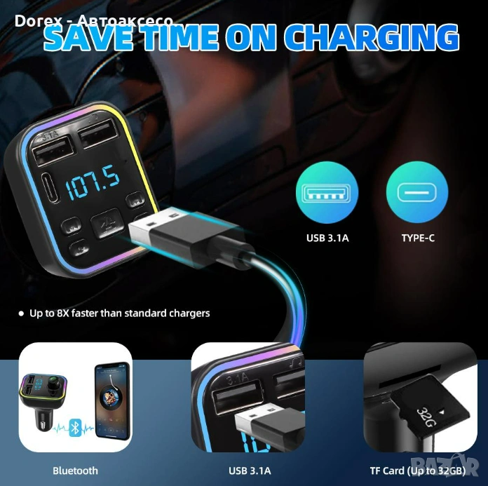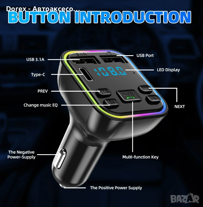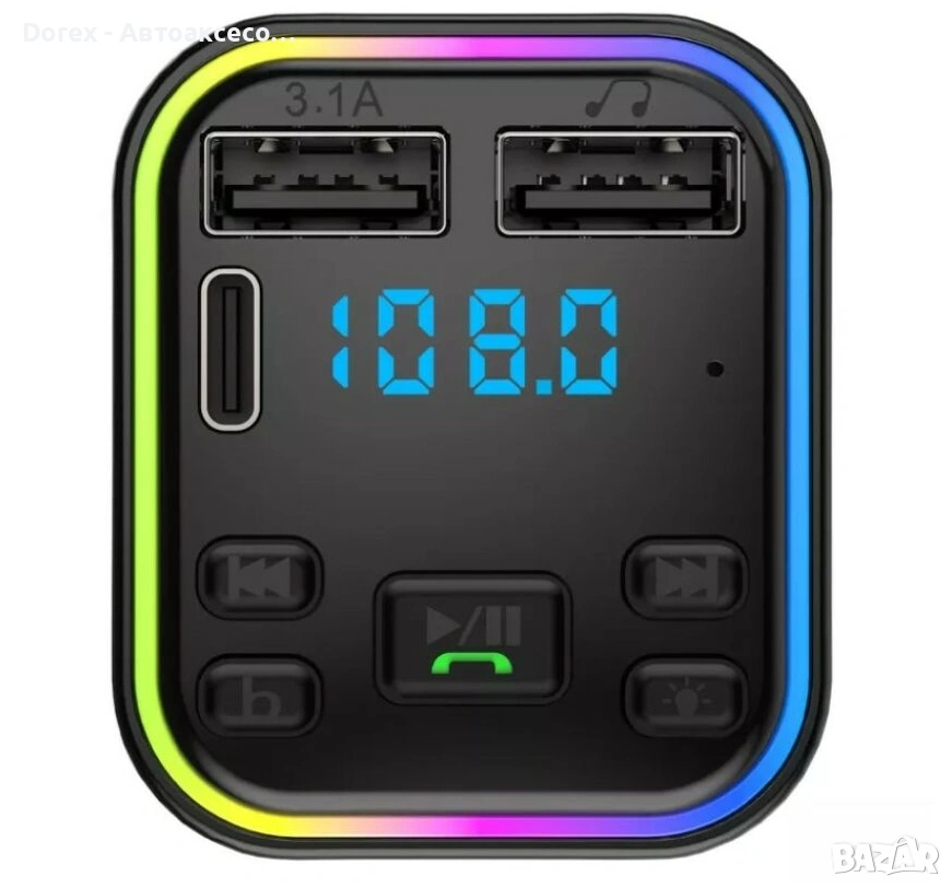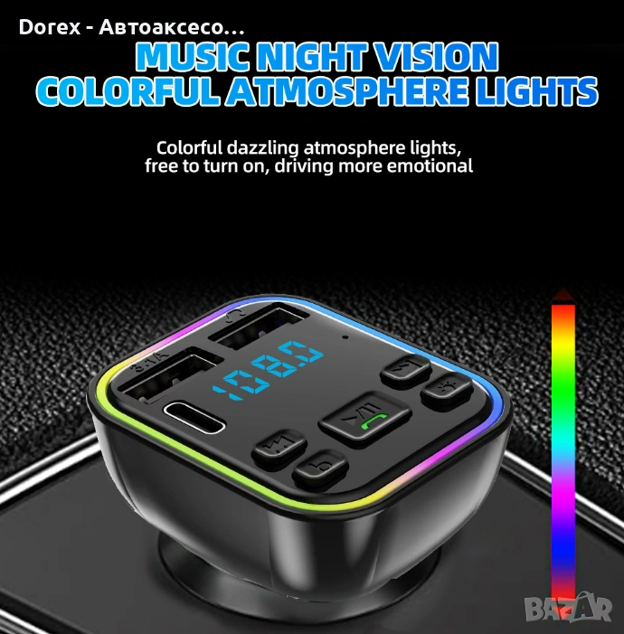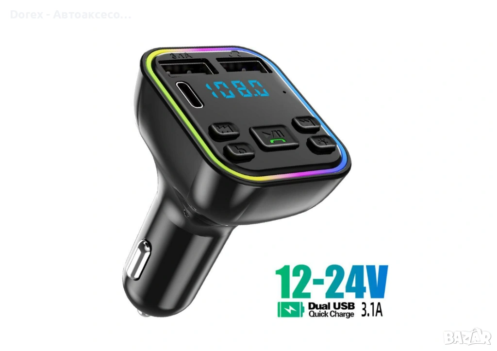 Моделът разполага с два USB порта и един Type-C порт с бързо зареждане до 3.1A, което позволява едновременно захранване на няколко устройства. Цветната подсветка с 7 режима придава модерен вид на интериора и улеснява използването през нощта. 🚗