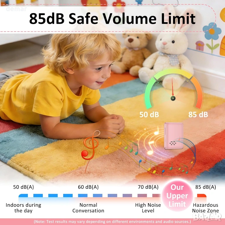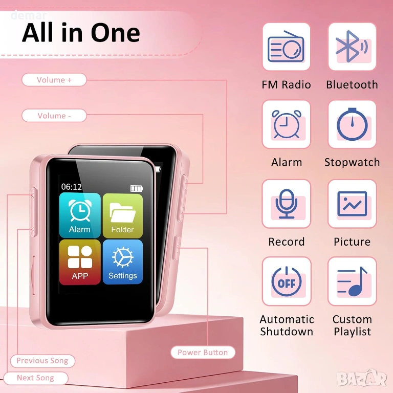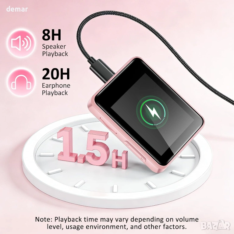 Компактен и лек преносим музикален плейър с включена 32GB TF карта и поддръжка за разширение до 512GB, което позволява съхранение на хиляди песни. Разполага с Bluetooth 5.2 за стабилна безжична връзка със слушалки и високоговорители, плюс AUX поддръжка за слушане с кабел. Оборудван с цветен дисплей, вграден високоговорител, FM радио (необходими са слушалки като антена), запис на глас, будилник и таймер за заспиване за гъвкава ежедневна употреба. Поддържа множество аудио формати и включва EQ звукови режими за персонализирано слушане, с ограничение на силата на звука до 85dB за защита на слуха. Осигурява до 50 часа възпроизвеждане с едно зареждане с бързо 1,5-часово презареждане. Комплектът включва слушалки, USB кабел, защитен калъф, протектор за екран, връзка за носене и ръководство за потребителя, което го прави подходящ за деца, студенти, пътуващи до работа, фитнес и пътувания.