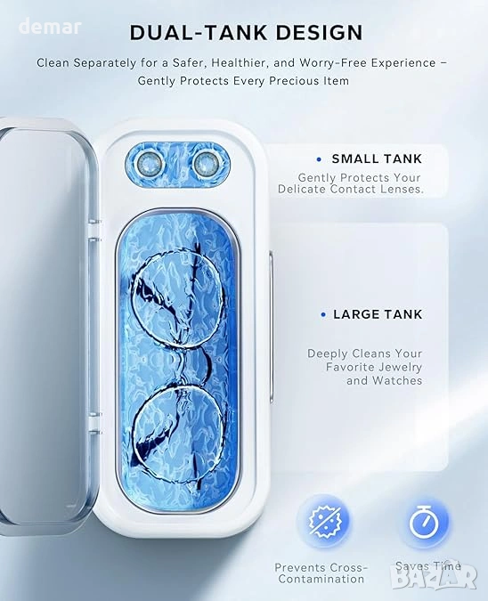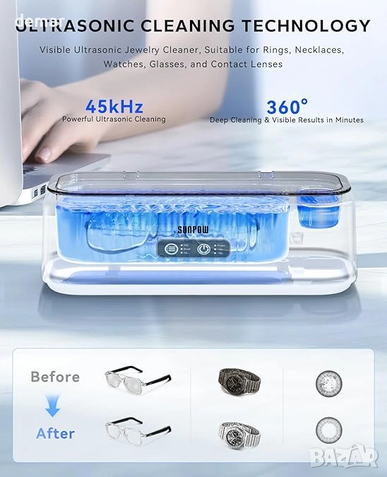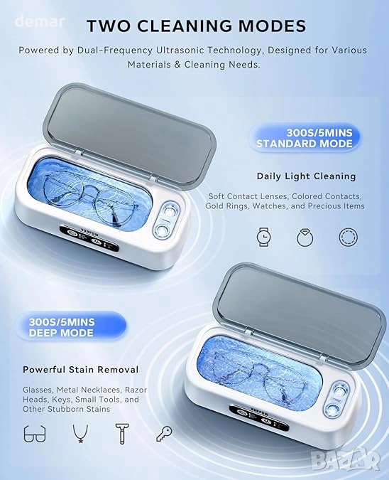 Двучестотният ултразвуков почистващ апарат SUNPOW използва 45kHz технология със стандартни и дълбоки режими на почистване, за да премахва нежно, но ефективно замърсявания, прах и пръстови отпечатъци от бижута, очила, часовници, протези, монети и контактни лещи, без да причинява драскотини или корозия. Двукамерният му дизайн включва по-голям резервоар от 270 мл за ежедневни ценности и отделен резервоар от 15 мл, специално за контактни лещи, предлагайки гъвкаво и хигиенично почистване в едно компактно устройство. Работейки с шум под 45 dB и с противоплъзгащи гумени крачета за допълнителна стабилност, той осигурява тиха и стабилна работа, подходяща за домашна или офис употреба. Устройството работи на DC12V с мощност 24 W и изисква само вода за работа, елиминирайки нуждата от агресивни химикали, като същевременно помага за защита на деликатните покрития и удължава живота както на устройството, така и на ценните ви вещи.