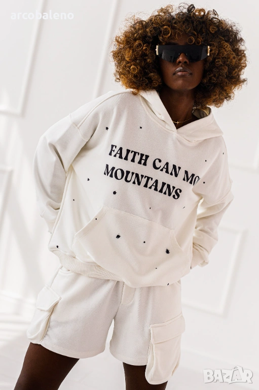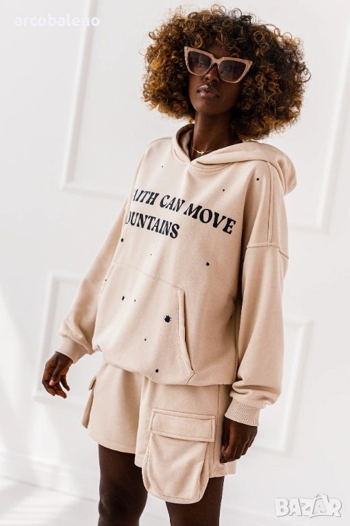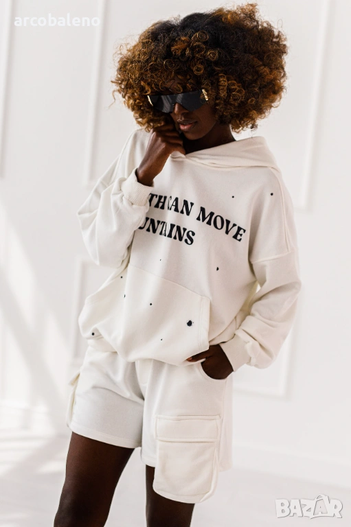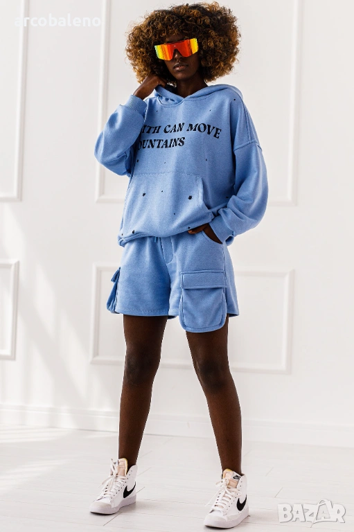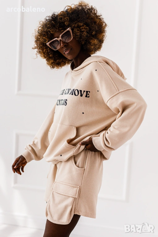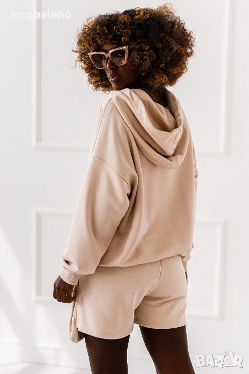 Дамски комплект от две части Luna. Големият суичър с качулка и късите панталони с джобове са перфектният дует - ежедневен, но с характер.