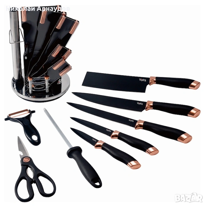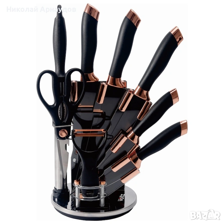Комплект ножове Oliver Voltz OV51633K9G, 9 части, Поставка, Черен/Розово злато, снимка 1 - Прибори за хранене, готвене и сервиране - 53606587 Комплект ножове Oliver Voltz OV51633K9G, 9 части, Поставка, Черен/Розово злато, снимка 2 - Прибори за хранене, готвене и сервиране - 53606587 1/2