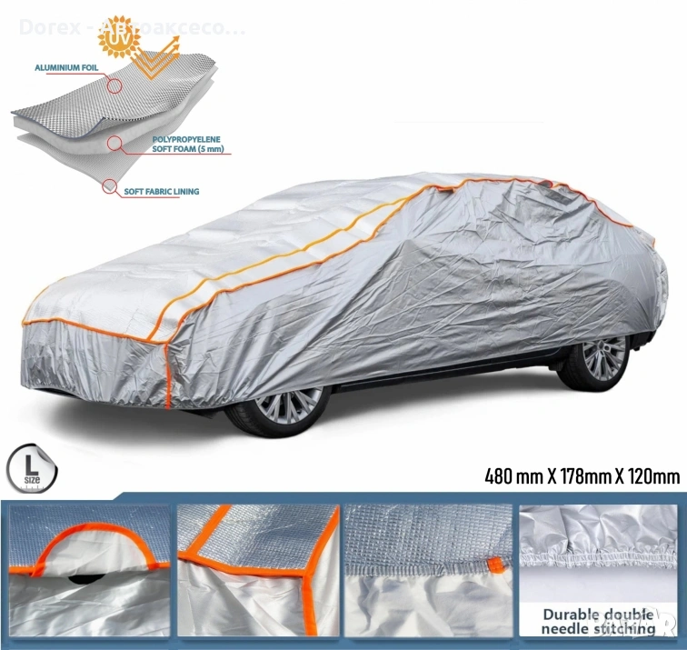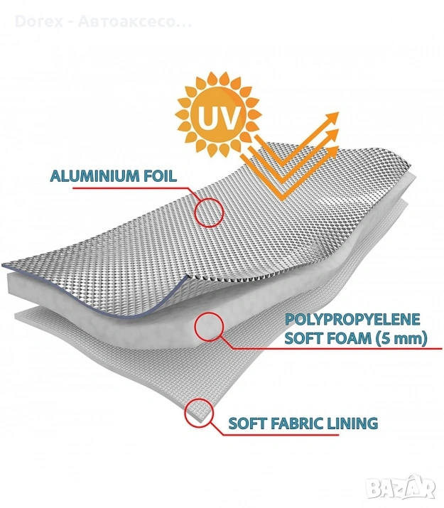 Покривалото е трислойно – външен слой от полипропиленов нетъкан текстил с алуминиево покритие за водоустойчивост, среден слой от дишащо фолио и мек вътрешен слой, който предпазва боята на автомобила от надраскване.