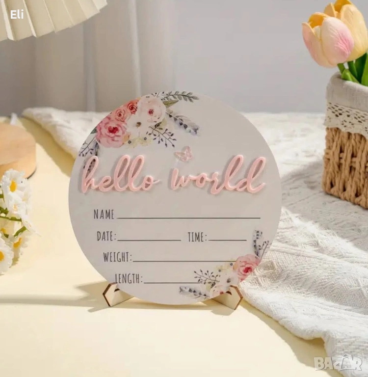 Ръчно изработено с любов от естествено дърво, с изящен надпис “Hello World”, който носи топлина, чистота и радост.