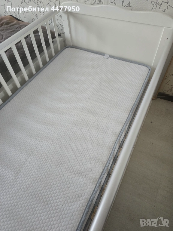 Ново бяло детско креватче с матрак и завивки. Креватчето може да е на две нива за деца от 0 до 8-9 г. Решетките могат да се махат и да спи детето и без тях / за по-големите /. Под матрака има голямо чекмедже за багаж.