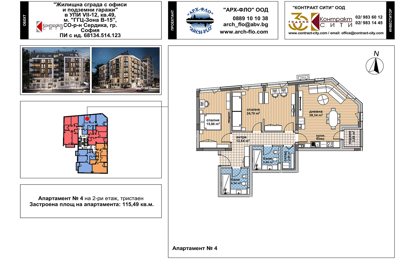 Контракт Сити продава просторен, много светъл апартамент, находящ се на втори етаж в новопостроена жилищна сграда Кара. Състои се от входно преддверие, ъглова дневна с кухненски бокс, една самостоятелна спалня и една двузонова стая, която може да бъде разделена на още две напълно самостоятелни спални, две големи бани с тоалетни и складово помещение в жилището. Продава се на шпакловка и замазка, изпълнено подово отопление на ТЕЦ с индивидуални термостати във всяка стая; изпълнено окабеляване и отръбяване за климатици за всяко жилищно помещение. Интериорни врати с естествен фурнир и обков. Сграда Кара е изпълнена с висококачествени материали и има изключително представителна и съвременна визия: френски прозорци с шесткамерна дограма с троен стъклопакет и подсилени шумоизолиращи свойства; окачена фасада от еталбонд, изолация от каменна вата; покрив от титан-цинкова ламарина. При интерес може да бъде закупено паркомясто в сутерена на сградата, като достъпът е с автомобилен асансьор. За повече детайли и други предложения от Контракт Сити: 0884278363, 0886600601