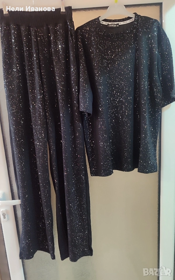 панталона е с широк крачол,тениска овърсайс.