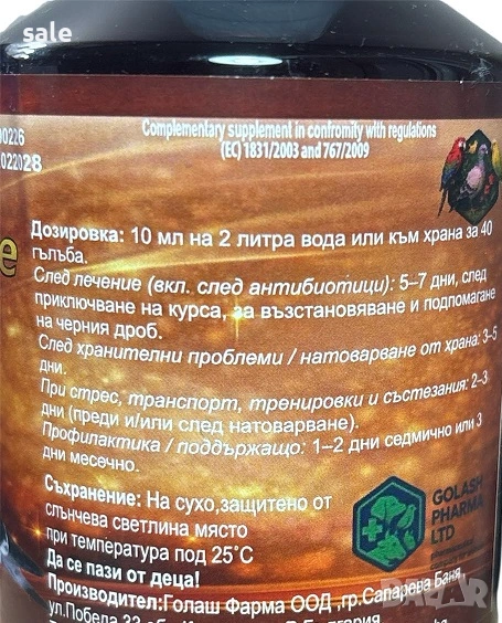 на 2 литра вода или към храната за 40 гълъба за период от 5-8 дена