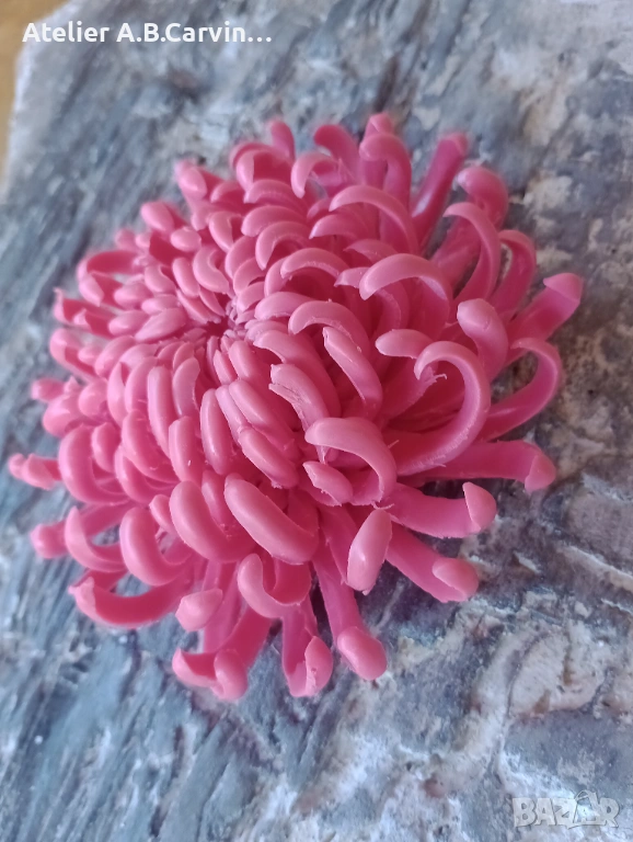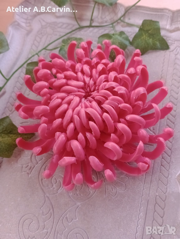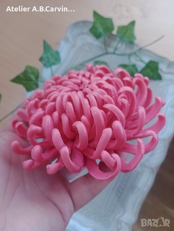 Този продукт е върхово постижение в карвинг занаята, при което всяко венчелистче е индивидуално изрязано и оформено с нож, за да се постигне характерната за живото цвете извивка. Подобна детайлност и сложност на формите са непостижими при стандартното използване на молдове. В Atelier ABCarving залагаме на 100% ръчна изработка върху висококачествена глицеринова база, което гарантира, че вашата хризантема е уникално произведение на приложното изкуство. Със своя фин аромат и реалистичен дизайн, тя е идеален избор за луксозна декорация или за подарък, който ще впечатли и най-взискателните естети.