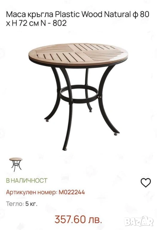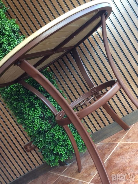 Краката и основата са метални, стабилна и устойчива е, плота е Polywood, в натурален цвят, много твърд PVC материал, който не променя цвета си и може да стои на открито. Цената й в момента е 358 лв, предлагам я за 140 лв. Изпращам по Еконт/Спиди, за Варна може лично предаване;)