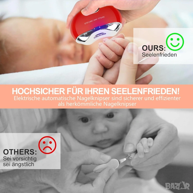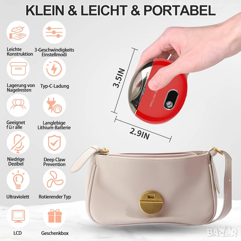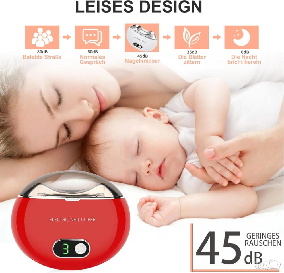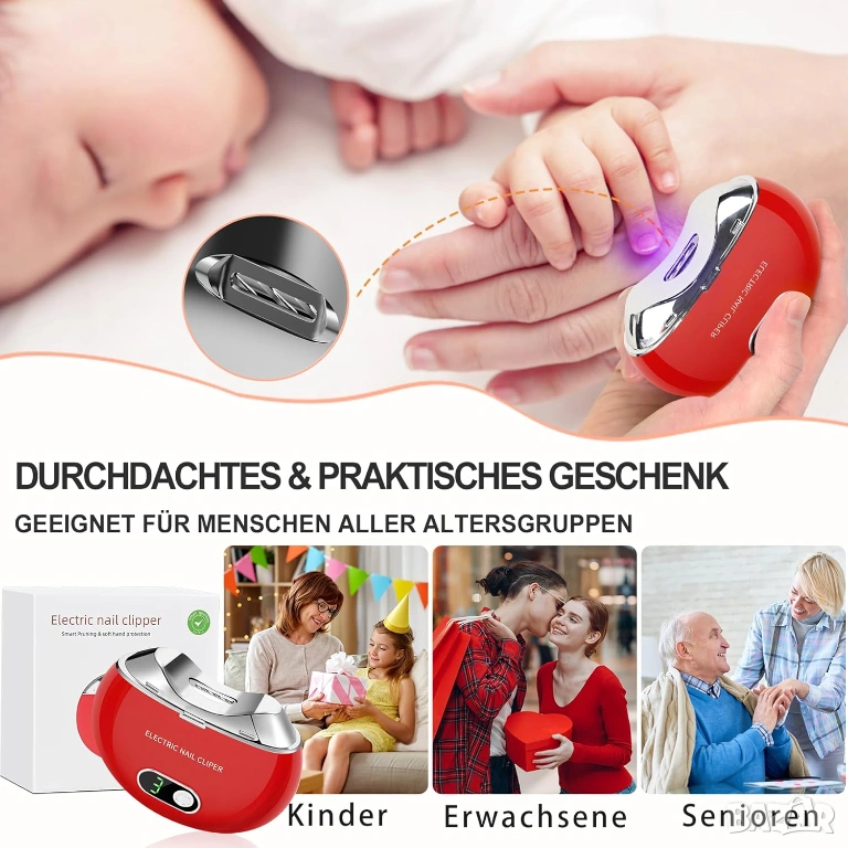 Безопасна: Тази електрическа нокторезачка е 100% безопасна. Можете да я използвате и за подгряване на ноктите на вашето бебе. Прецизните и остри ножчета са скрити зад процеп, който предпазва пръстите. Дори и при директно докосване, няма опасност да се порежете. Идеална както за бебета, така и за възрастни. Лесна за употреба: Използва се много лесно. Тя може да се ползва както от деца, така и от възрастни, без да я изучавате много. Необходимо е да натиснете само един бутон, а тя след това знае какво да направи. Тя оформя ноктите перфектно, като дори не ви е необходимо пила след нея. А целия остатът1ен продукт след работата й, събира в кошче, което се намира отпред. По този начин можете да забравите за мръсотията, след рязането на нокти. Електрическа: Лесна за употреба и зареждане с usb кабел. Мотора и е прецизен, като има много ниско ниво на шум и дори няма да чуете.
