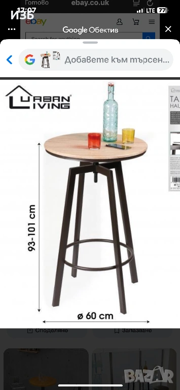Бар с регулируема височина - Винтидж елегантност, Размери 60x60x101 см. Добавете нотка ретро чар към вашето пространство с този бар във винтидж стил с регулируема височина. С размери 60x60x101 см, този бар е идеален за малки пространства или за създаване на уютен кът във вашата всекидневна или кухня. Дизайнът му, вдъхновен от винтидж мебели, и винтидж покритието му го правят истински декоративен елемент, както и практичен благодарение на механизма му за регулируема височина. Характеристики на продукта: Тип продукт: Бар с регулируема височина Размери: 60 см (диаметър) x 101 см (максимална височина) Стил: Винтидж Материал: Метал и състарено дърво за автентичен ретро ефект Регулируема височина: Барът може да се регулира по височина според вашите нужди Предимства на бара с регулируема височина във винтидж стил: Елегантен винтидж дизайн: Вдъхновен от винтидж мебели, този бар предлага уникален ретро вид, който се интегрира както в модерен, така и в традиционен декор. Регулируема функционалност: Благодарение на механизма си за регулируема височина, можете да адаптирате този бар към вашите нужди, независимо дали за сервиране на напитки или за създаване на приветливо пространство. Универсалност: Този бар може да се използва в кухнята, в хола или дори на тераса за вашите приеми. Здравина: Изработен от качествен метал и дърво, този бар е проектиран да издържи, като същевременно запази автентичен винтидж стил. Лесна поддръжка: Дървото и състареният метал се почистват лесно с влажна кърпа, което гарантира лесна поддръжка. Защо да изберете този бар във винтидж стил с регулируема височина? Уникален винтидж стил: Мебел, която добавя нотка ретро елегантност към всеки интериор. Практичен и регулируем: Регулируемата височина ви позволява да адаптирате бара към вашите нужди и налично пространство. Лесен монтаж: Доставян готов за употреба, този бар е лесен за инсталиране във вашия дом без сложен монтаж.