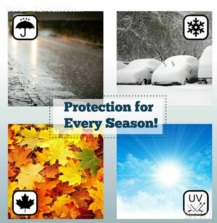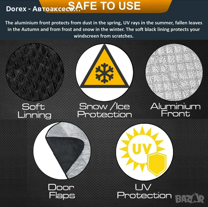 Покривалото осигурява допълнителна защита срещу градушка, прах и киселинни дъждове, като помага да запазите стъклото чисто и защитено. Изработено е от алуминиево фолио с мека памучна подплата за по-добра изолация и щадящ контакт със стъклото.