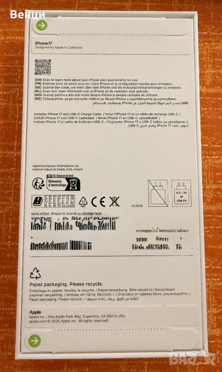 Продавам Apple iPhone 17 с 256 GB памет в цвят Mist Blue.